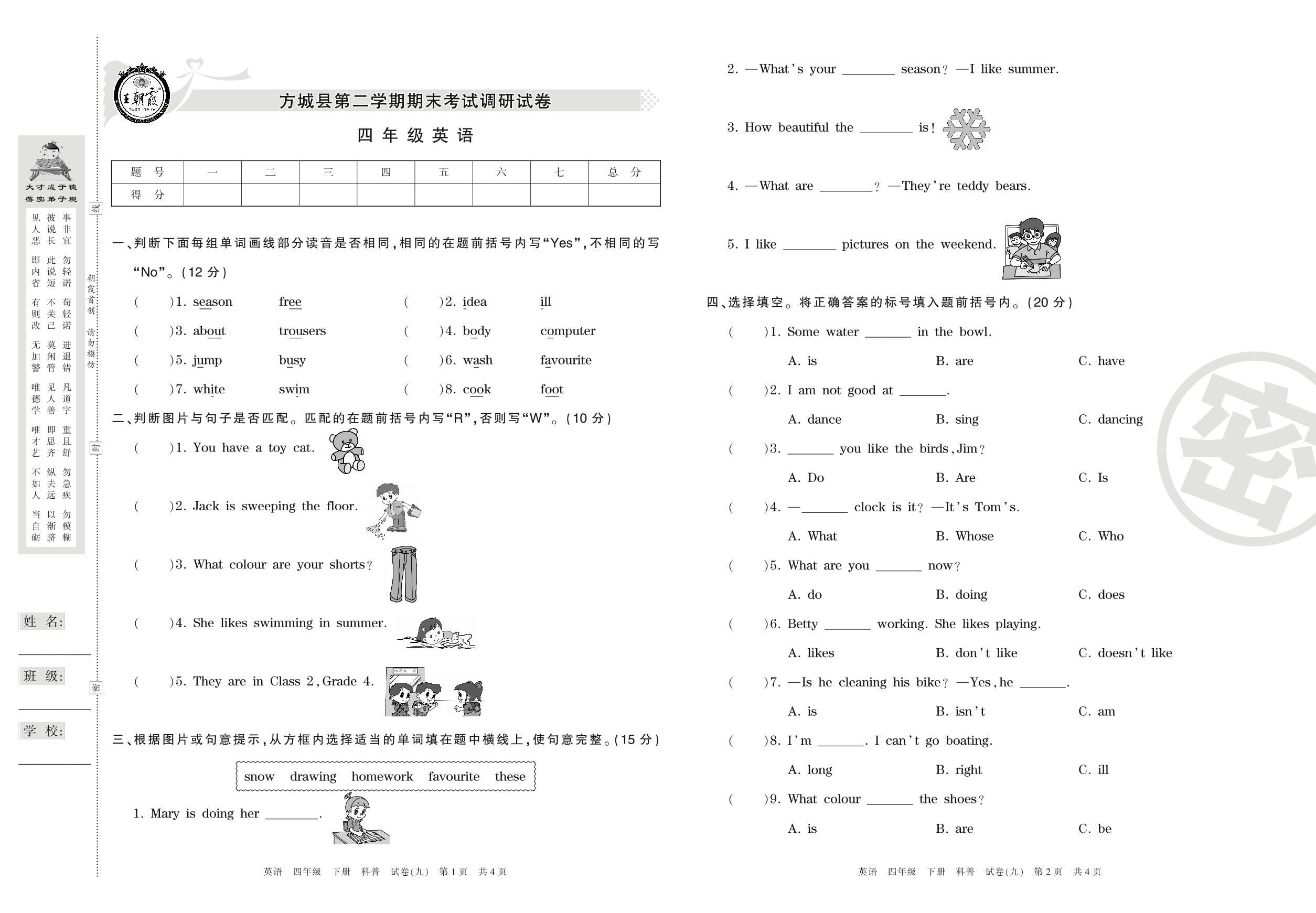2015-2016学年第二学期南阳市方城县四年级英语试卷(科普版)【9】