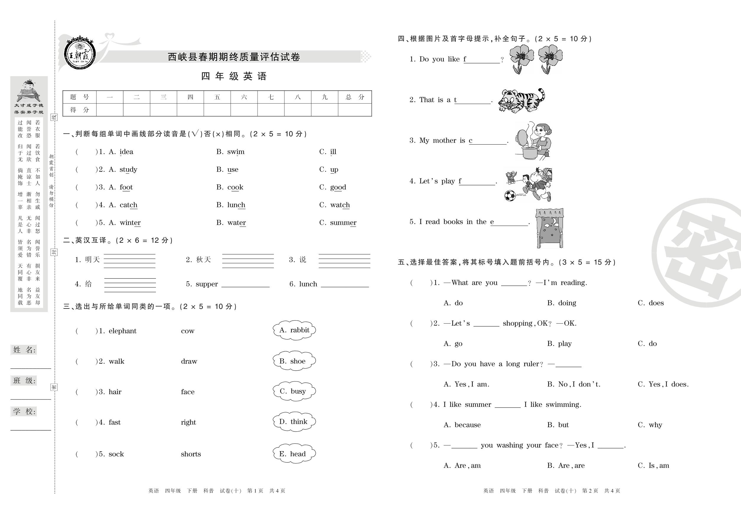 四年级英语科普版下册期末卷