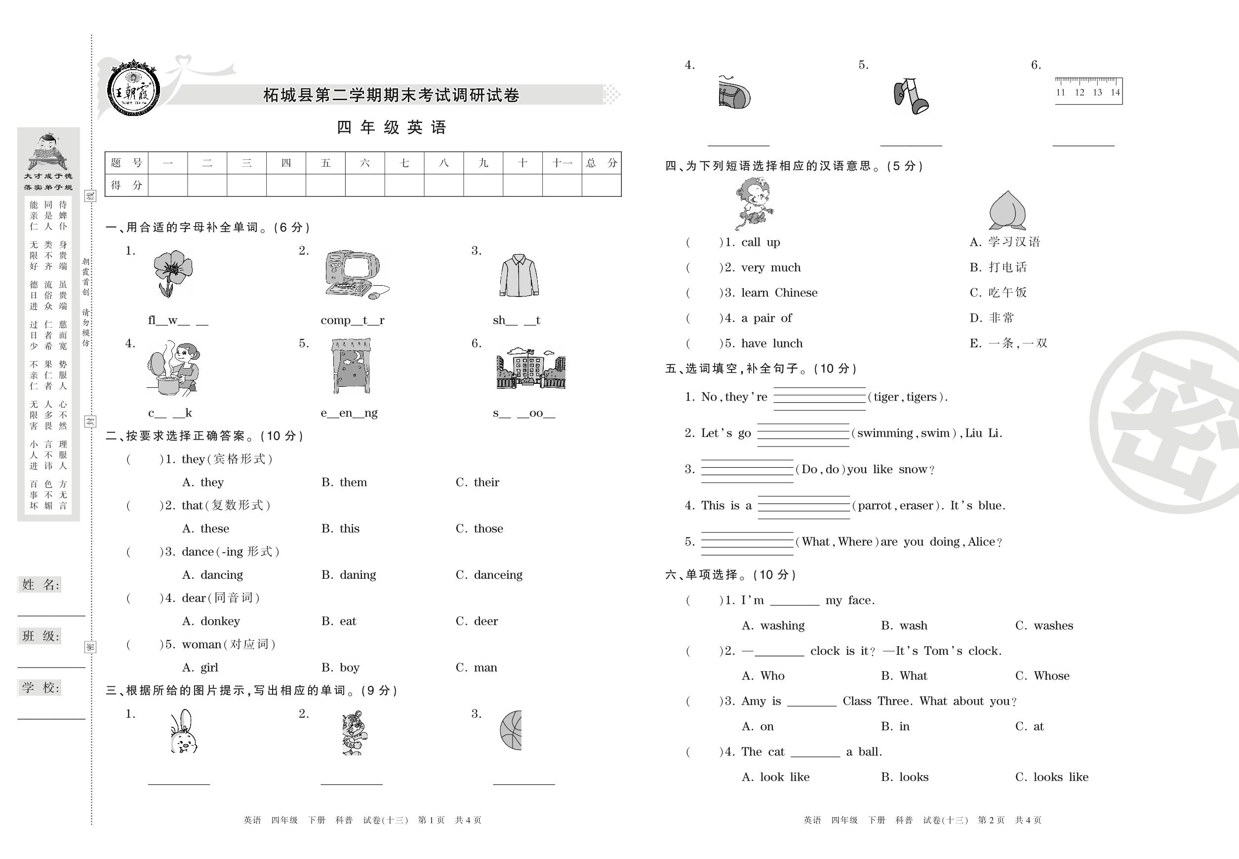 2015-2016学年第二学期商丘市柘城县四年级英语试卷(科普版)【13】