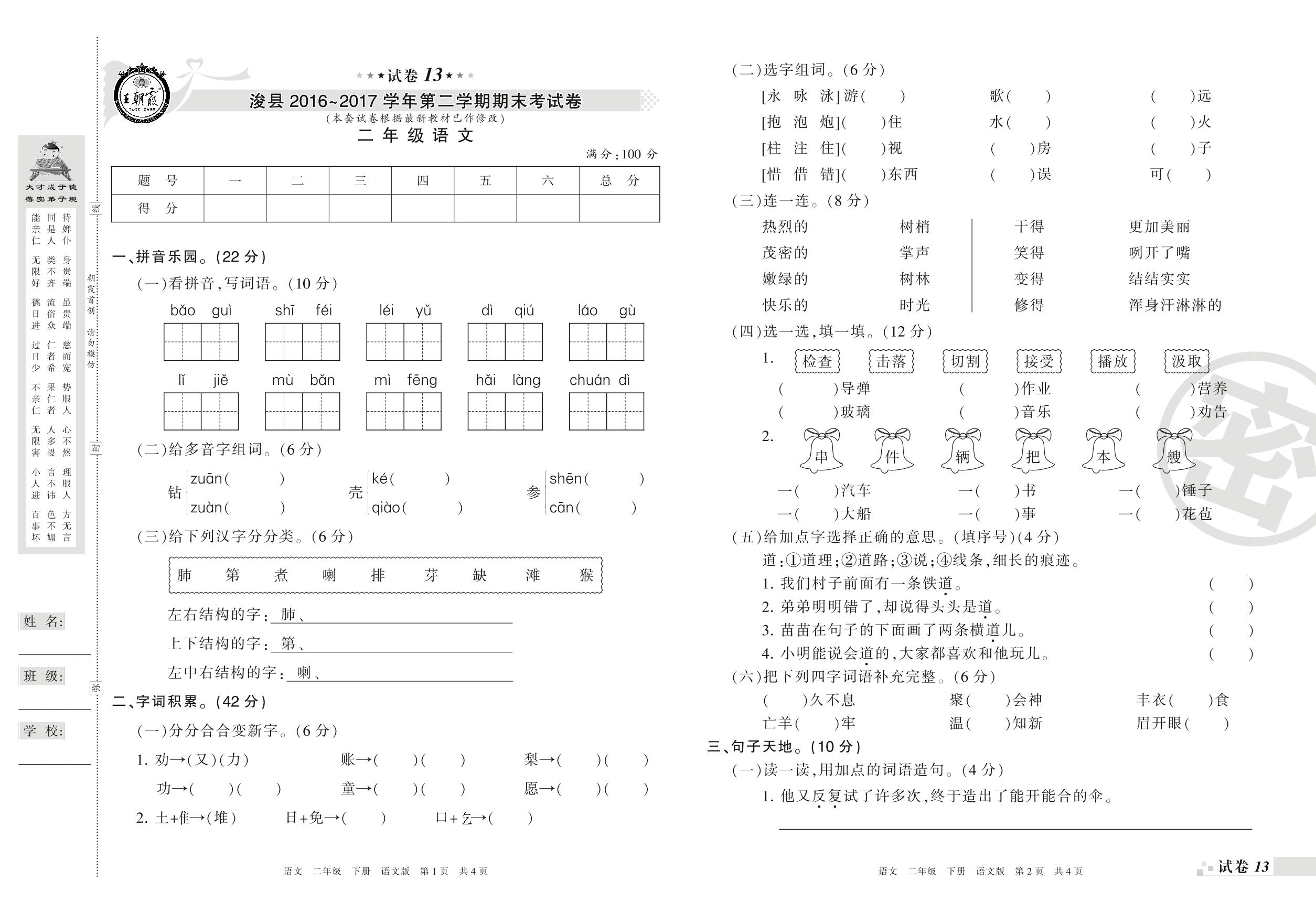 2016-2017学年第二学期鹤壁市浚县二年级语文试卷(语文版)【13】