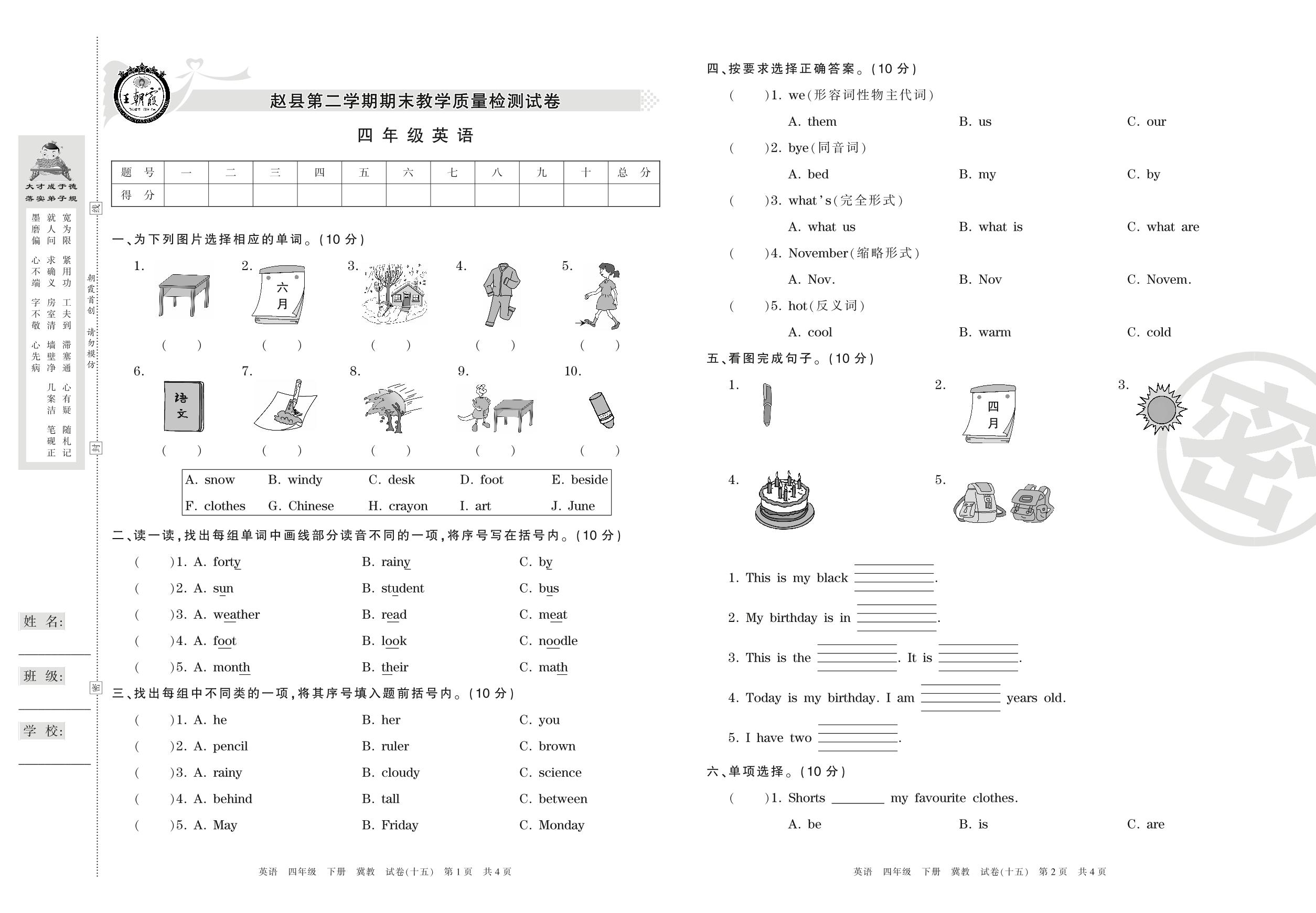 2015-2016学年第二学期石家庄市赵县四年级英语试卷(冀教版)【15】