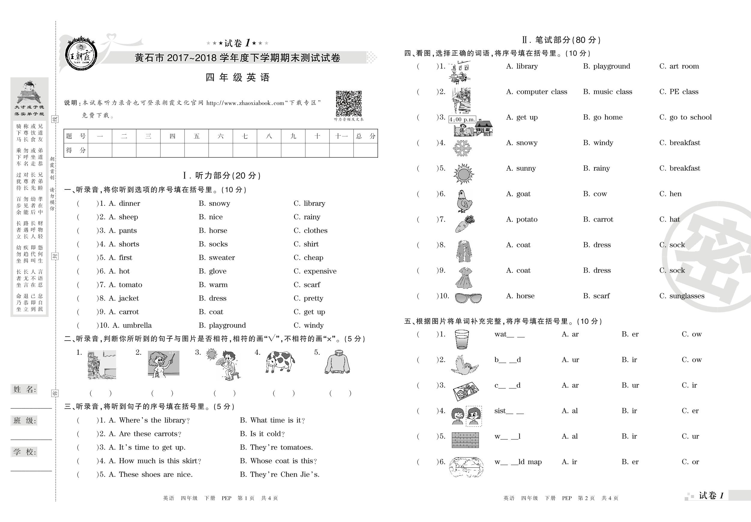 2017-2018学年第二学期黄石市四年级英语试卷(PEP版)【1】