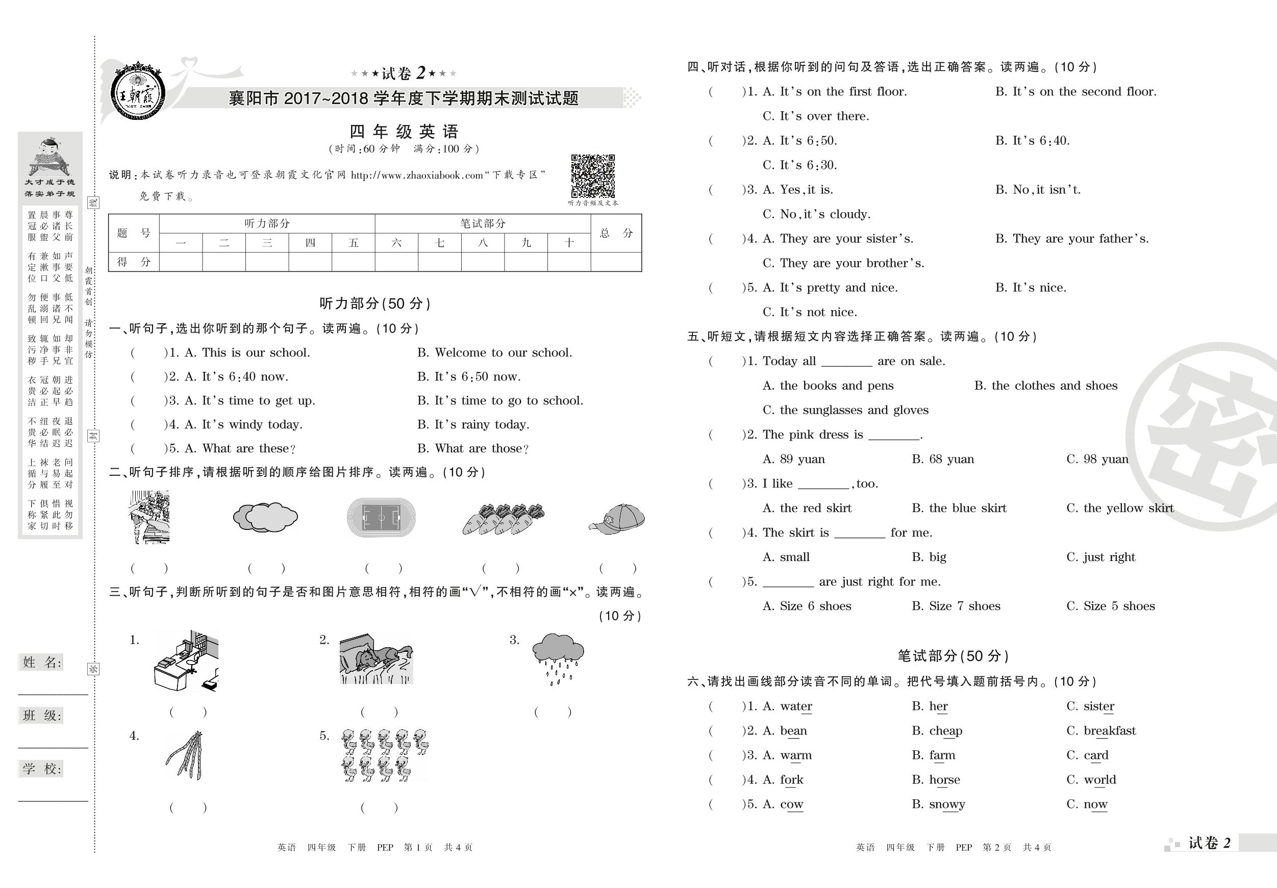 2017-2018学年第二学期襄阳市四年级英语试卷(PEP版)【2】