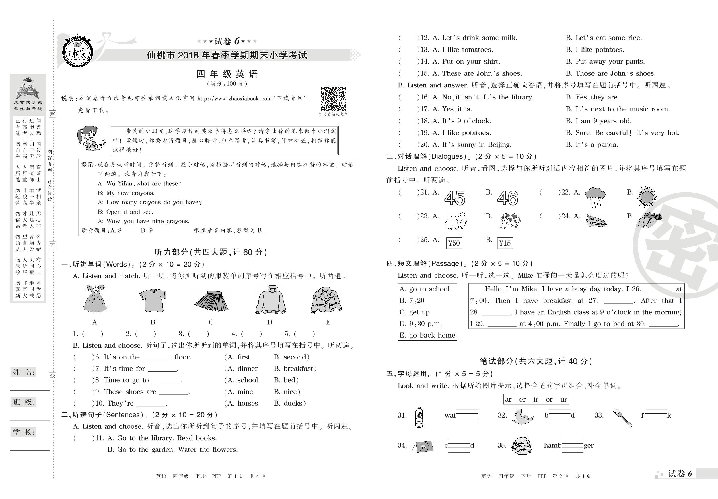 2017-2018学年第二学期仙桃市四年级英语试卷(PEP版)【6】