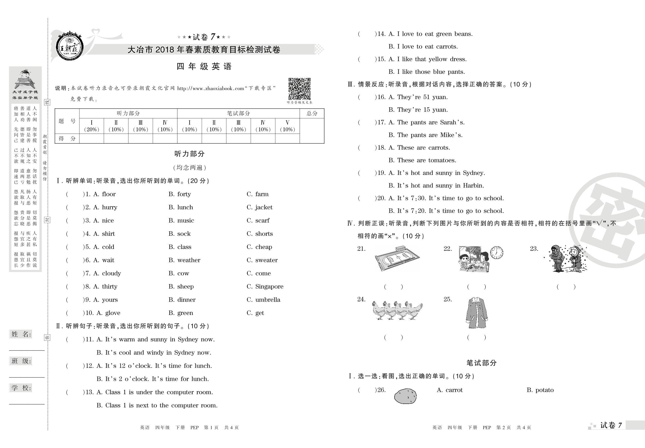 2017-2018学年第二学期大冶市四年级英语试卷(PEP版)【7】