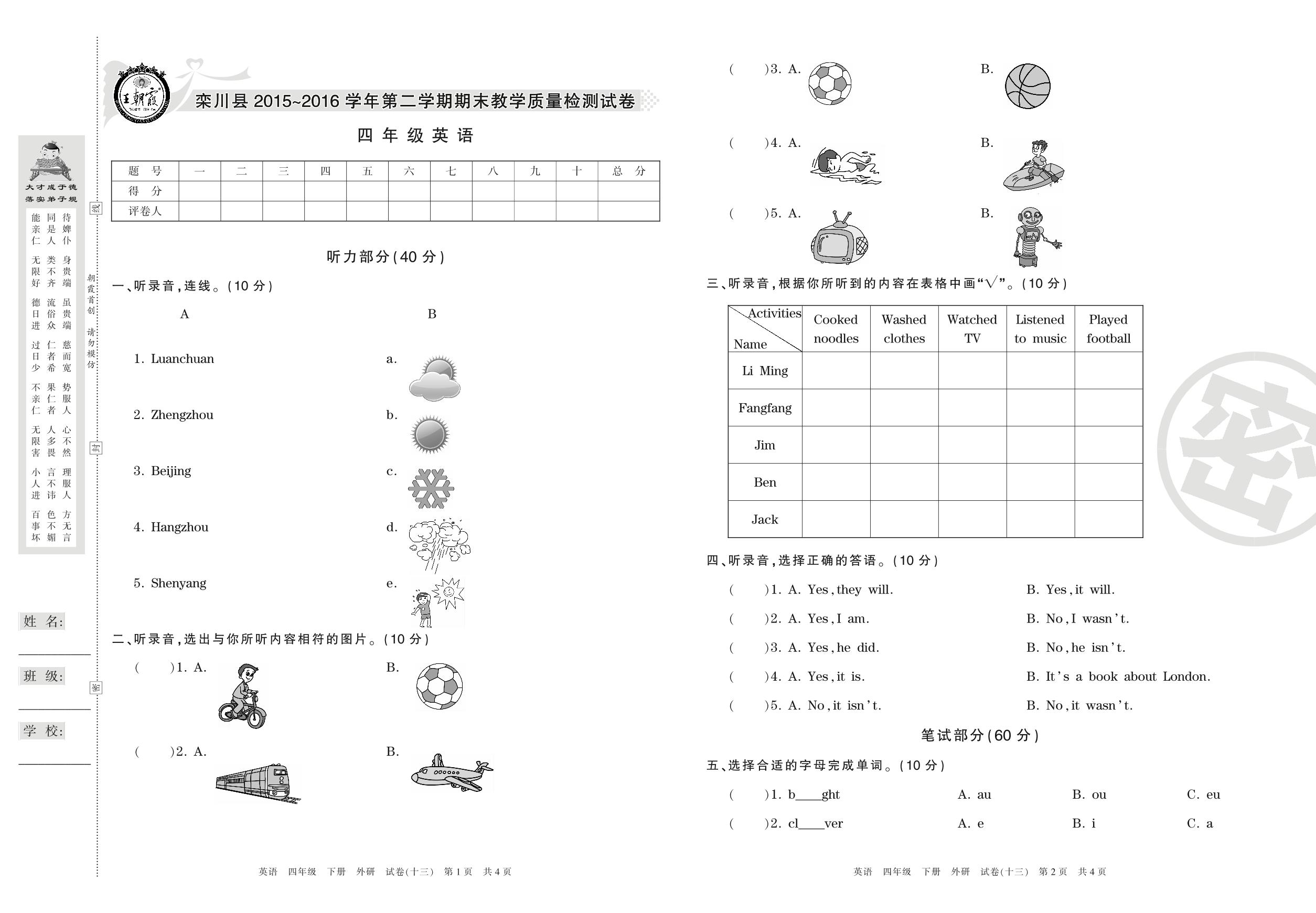 2015-2016学年第二学期洛阳市栾川县四年级英语试卷(外研版)【13】