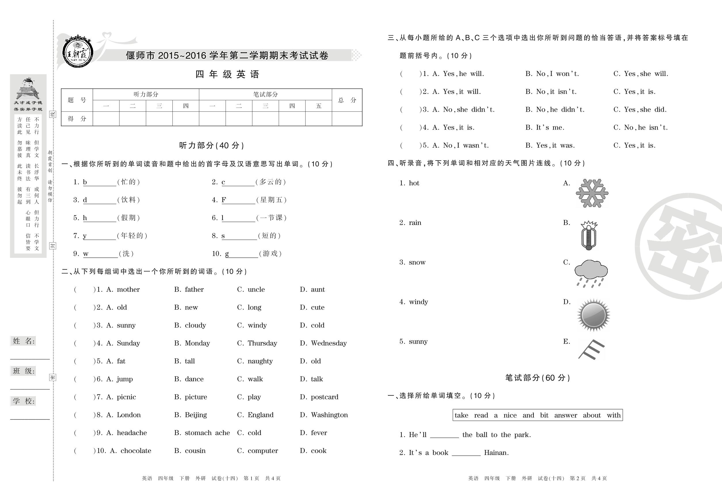 2015-2016学年第二学期偃师市四年级英语试卷(外研版)【14】