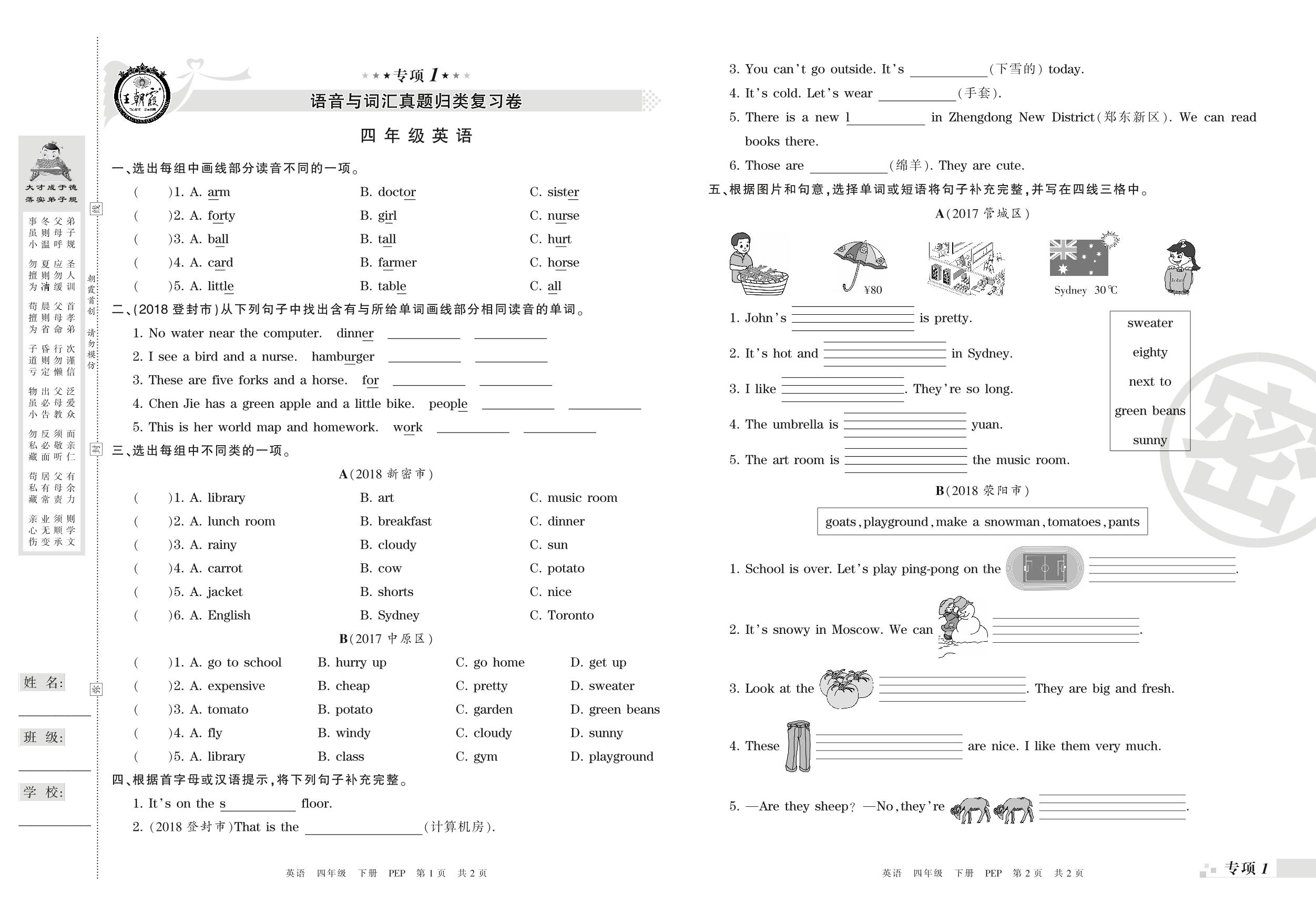 王朝霞期末专项卷——语音与词汇、句子真题归类复习卷四年级下册英语(PEP版)_R21080795739【0】