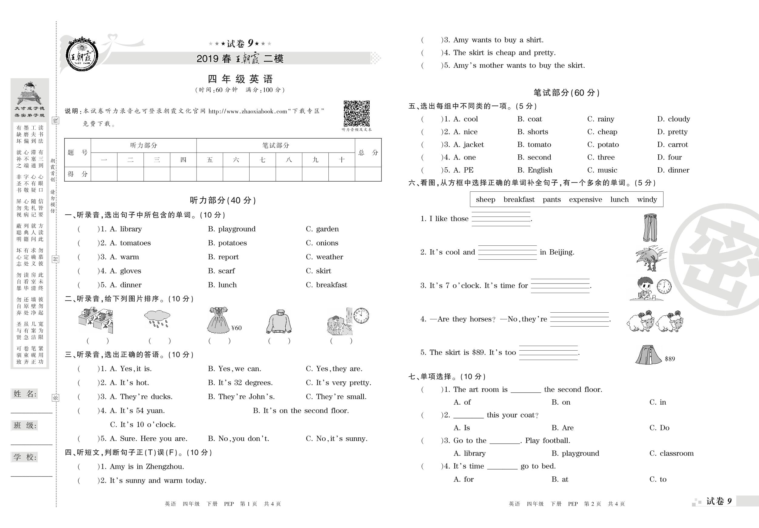 王朝霞期末模拟卷四年级下册英语(PEP版)_R21080795820【9】