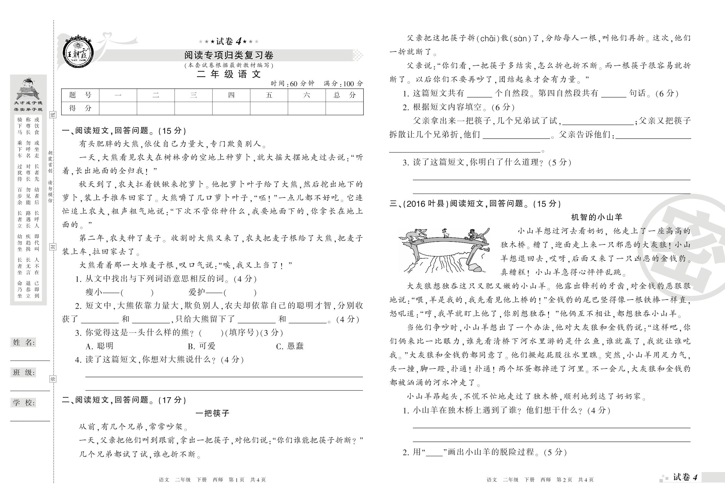 王朝霞期末专项卷——阅读专项归类复习卷二年级下册语文(西师版)_R21080181432【4】