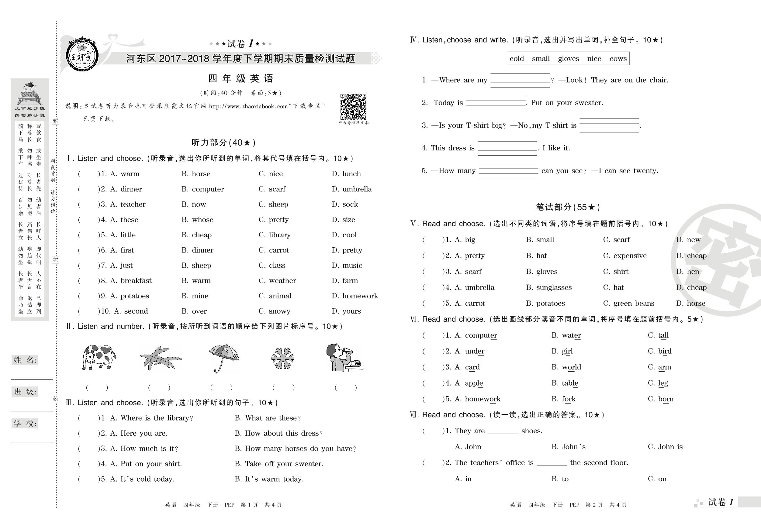 2017-2018学年第二学期临沂市河东区四年级英语试卷(PEP版)【1】