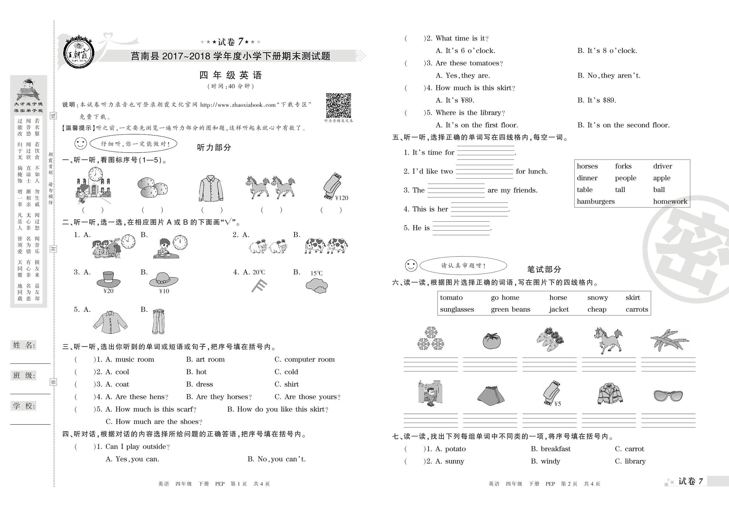 2017-2018学年第二学期临沂市莒南县四年级英语试卷(PEP版)【7】