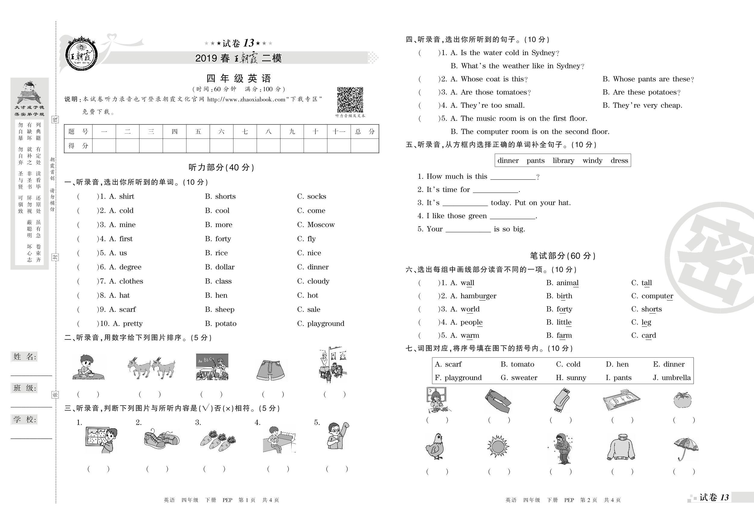 王朝霞期末模拟卷四年级下册英语(PEP版)【13】