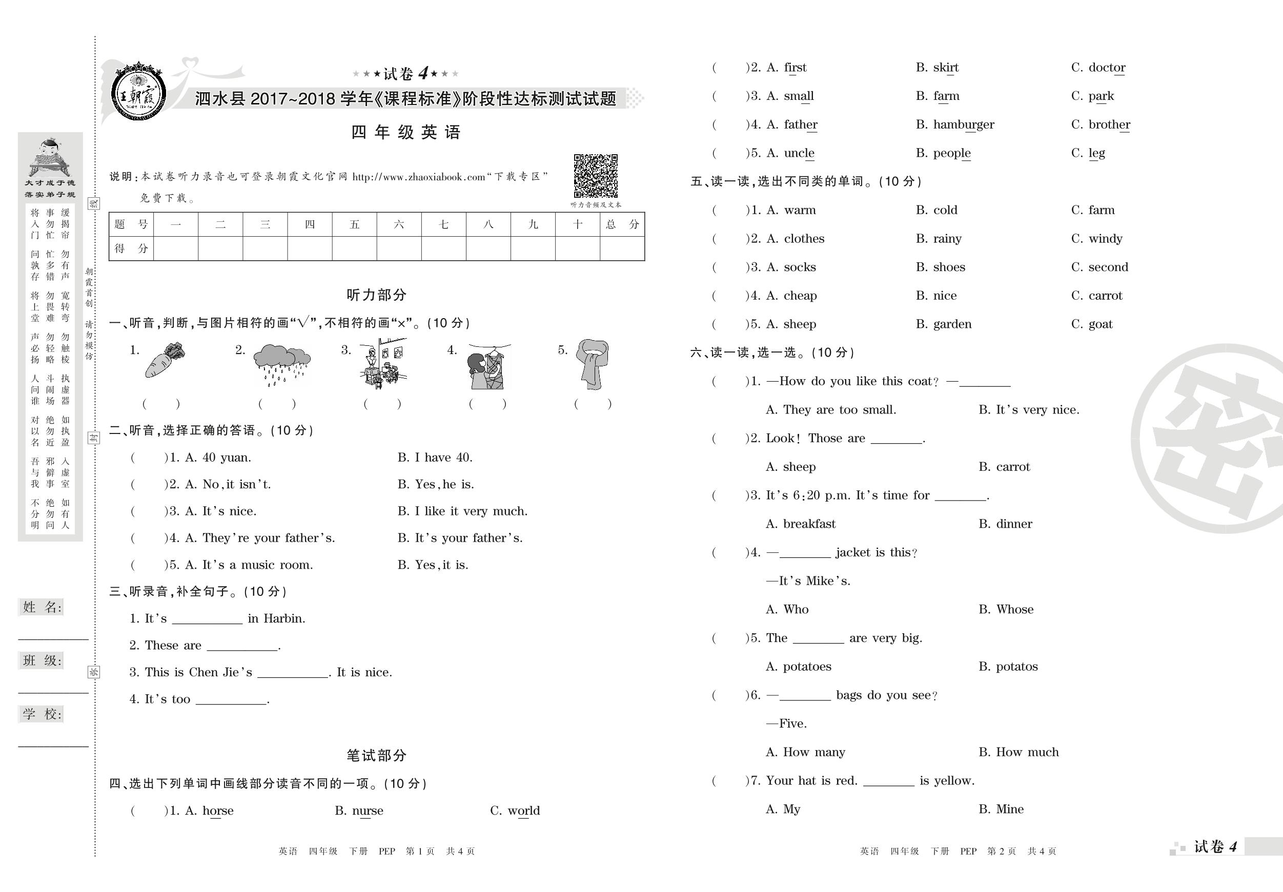 2017-2018学年第二学期济宁市泗水县四年级英语试卷(PEP版)【4】