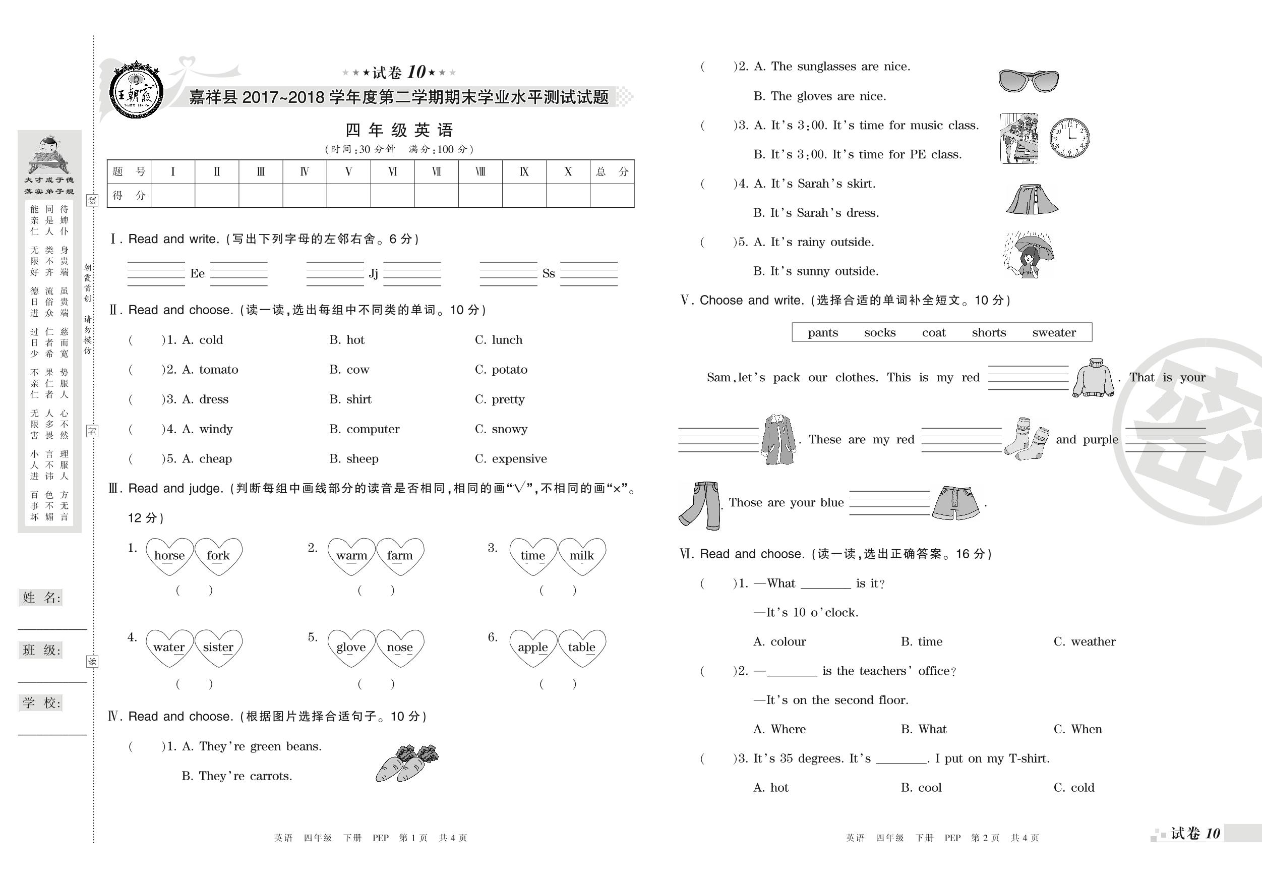 2017-2018学年第二学期济宁市嘉祥县四年级英语试卷(PEP版)【10】