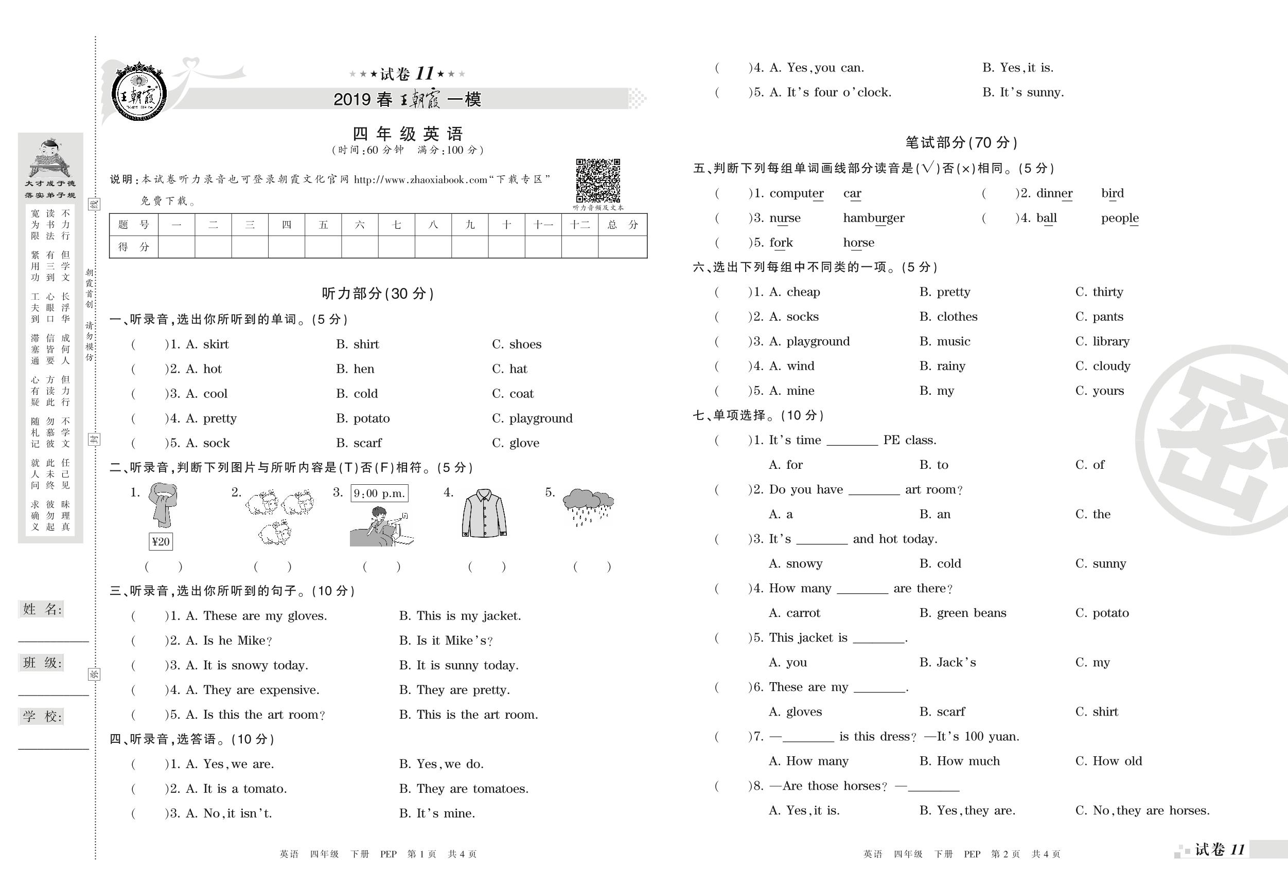 王朝霞期末模拟卷四年级下册英语(PEP版)_R210807100122【11】