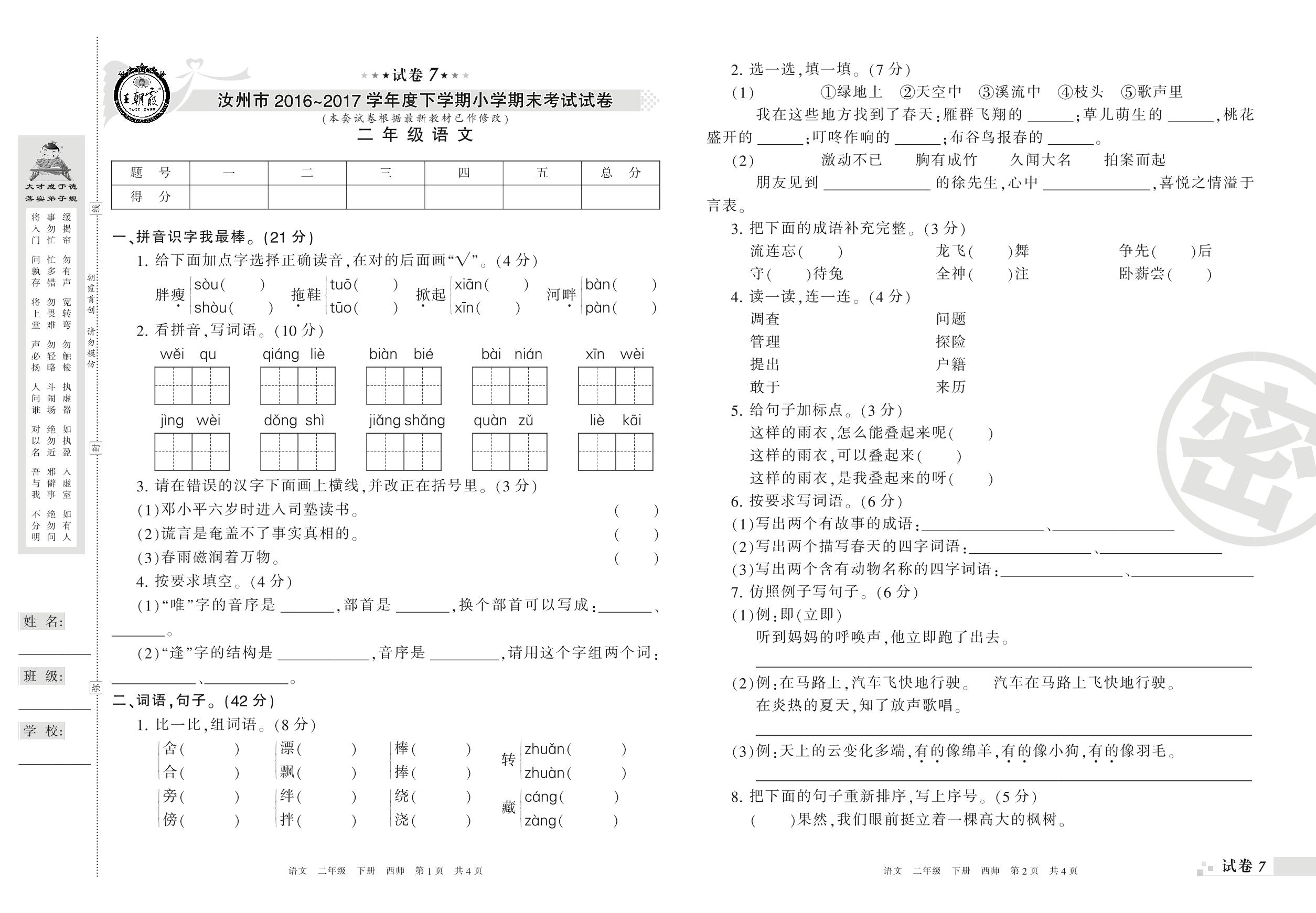 2016-2017学年第二学期汝州市二年级语文试卷(西师版)【7】