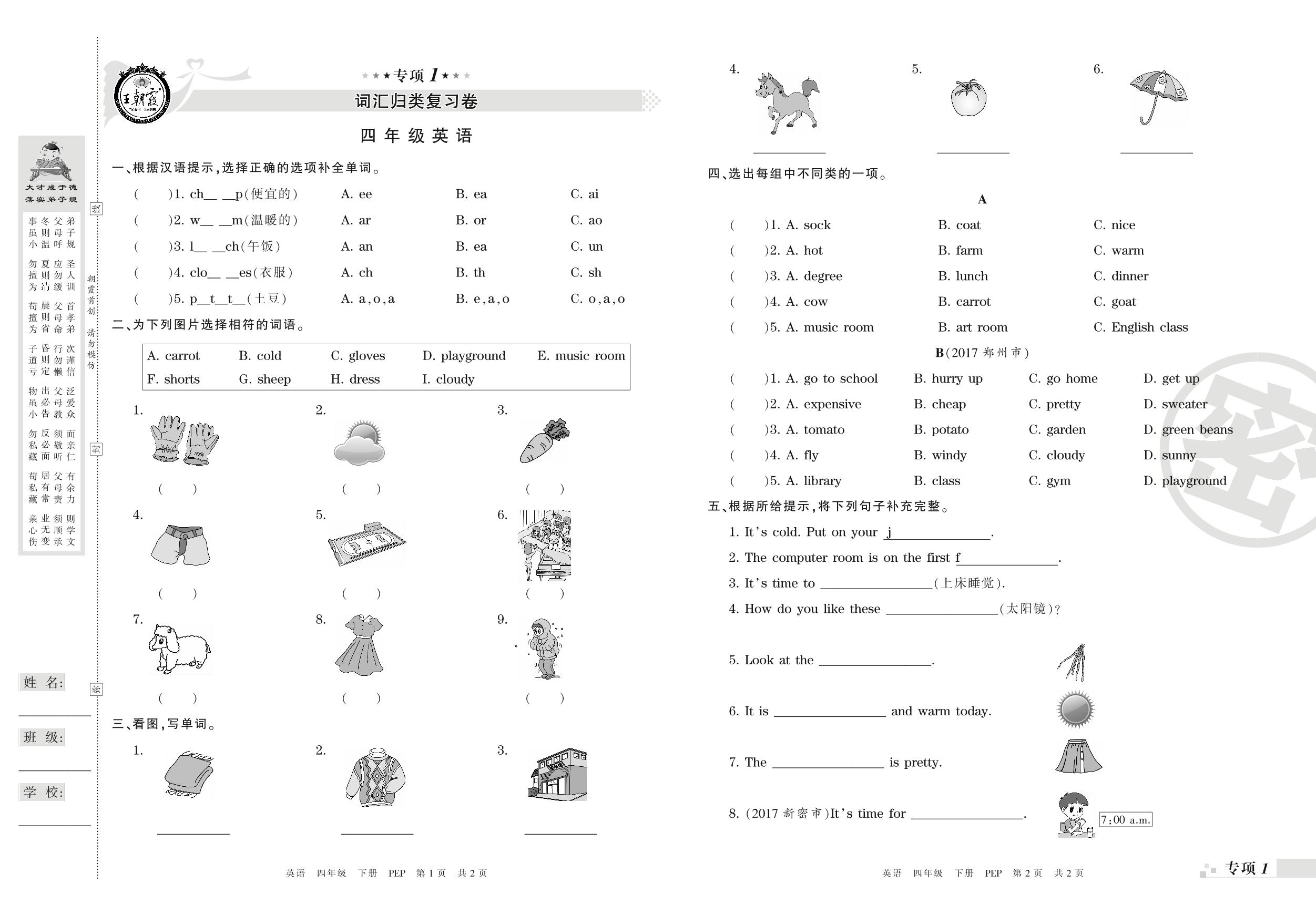 王朝霞期末专项卷——词汇、句子真题归类复习卷四年级下册英语(PEP版)_R210807100147【0】