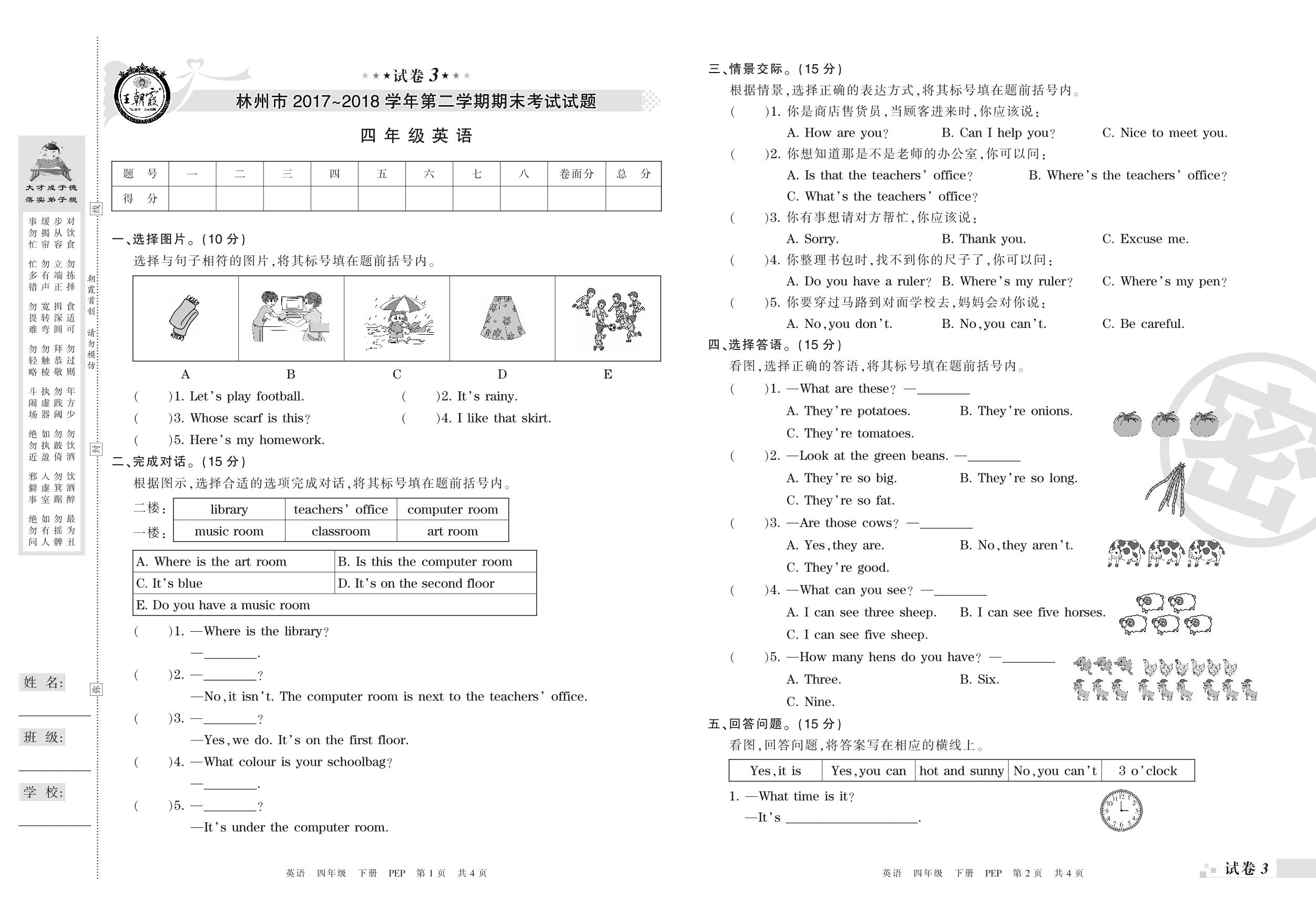2017-2018学年第二学期林州市四年级英语试卷(PEP版)【3】