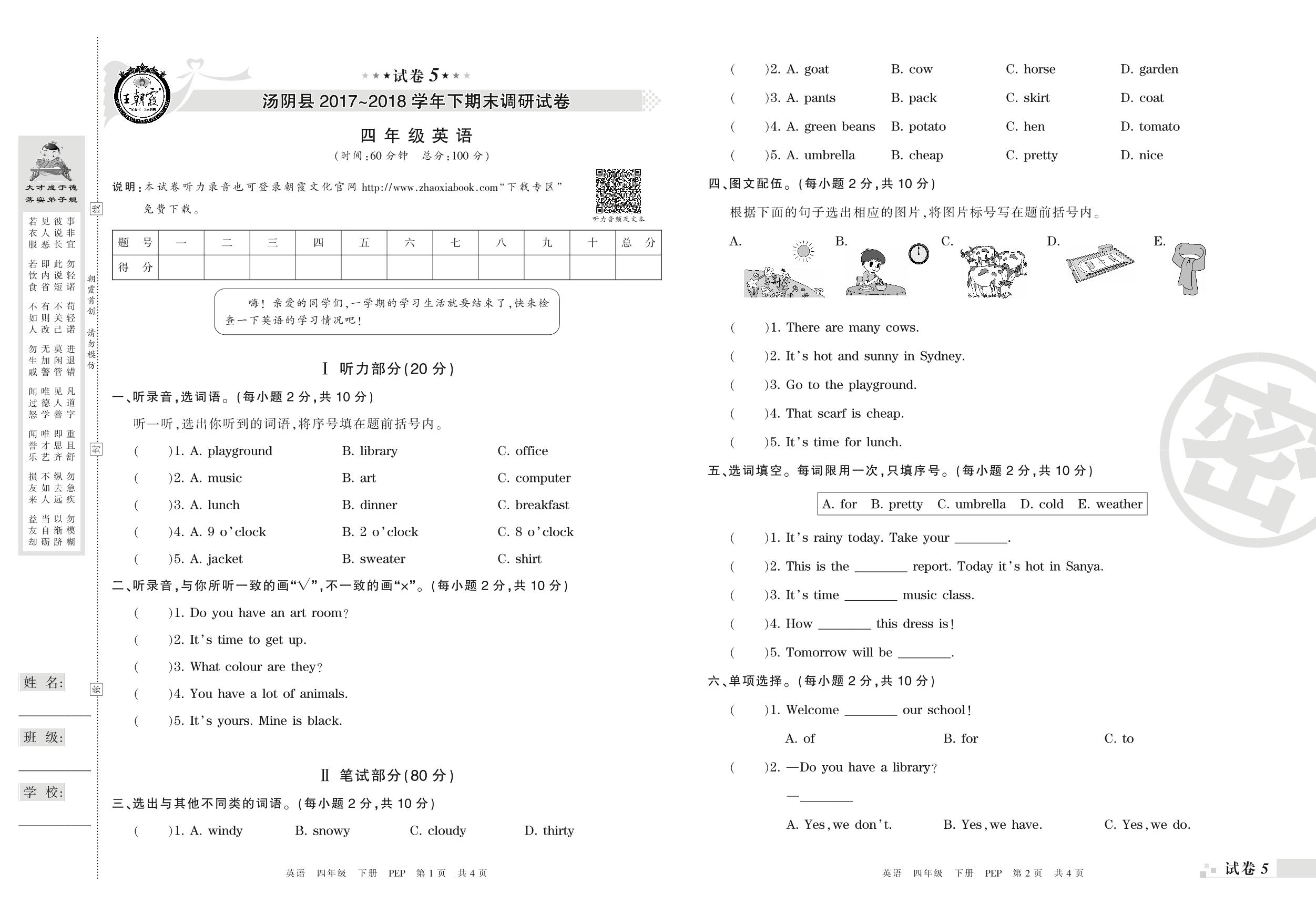 2017-2018学年第二学期安阳市汤阴县四年级英语试卷(PEP版)【5】