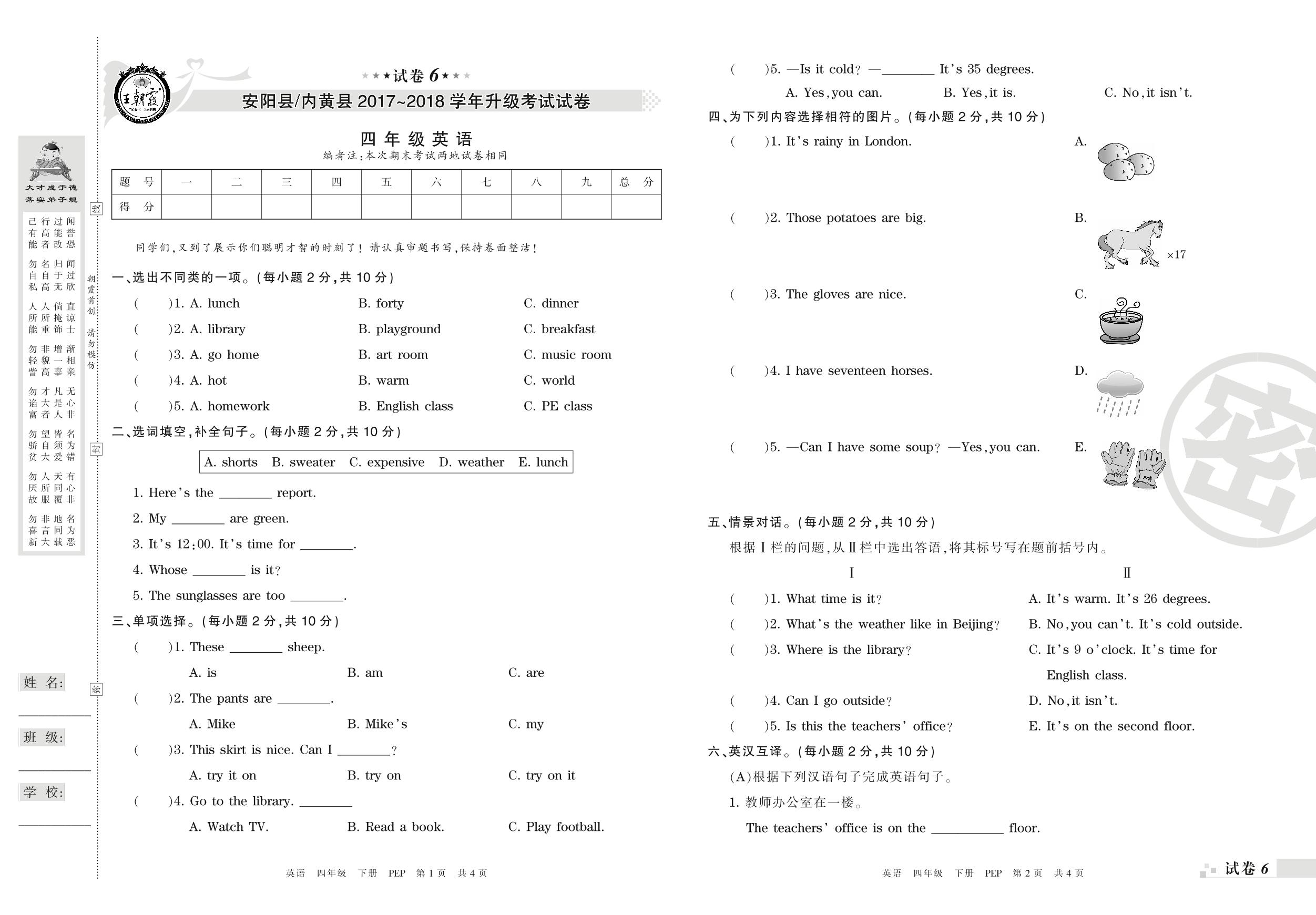 2017-2018学年第二学期安阳市安阳县、内黄县四年级英语试卷(PEP版)【6】