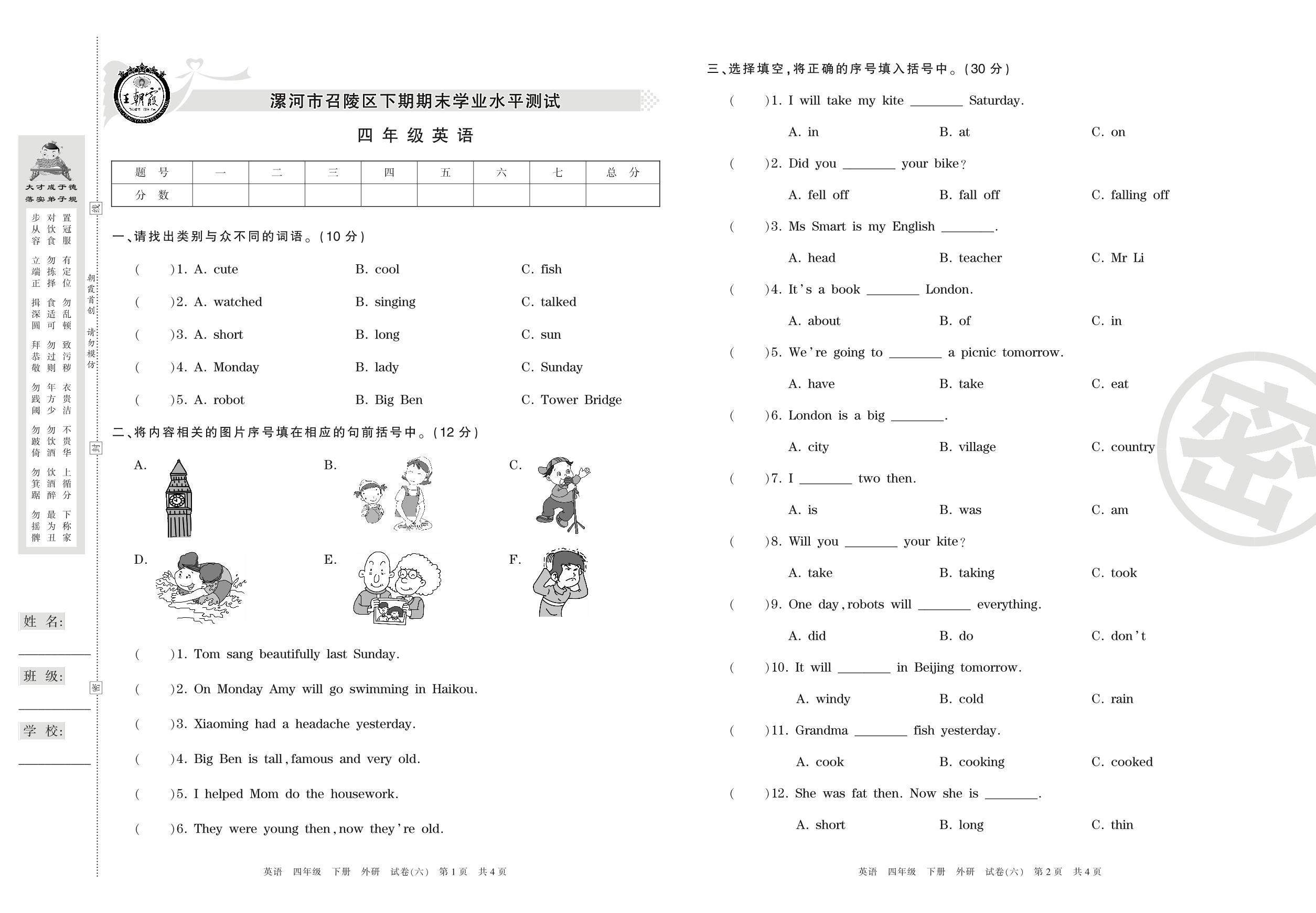 四年级英语外研版(三起始)下册期末卷