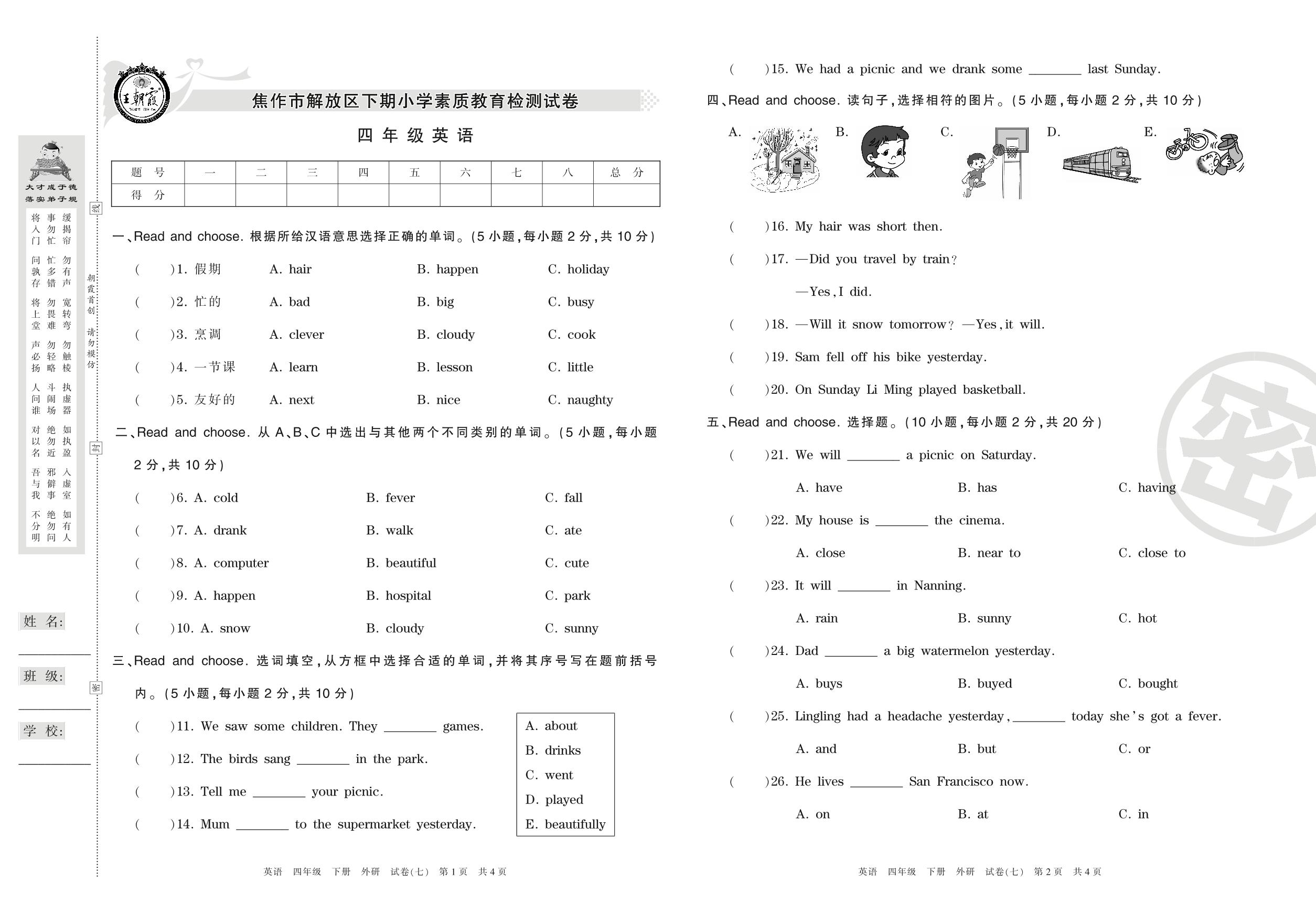 2015-2016学年第二学期焦作市解放区四年级英语试卷(外研版)【7】