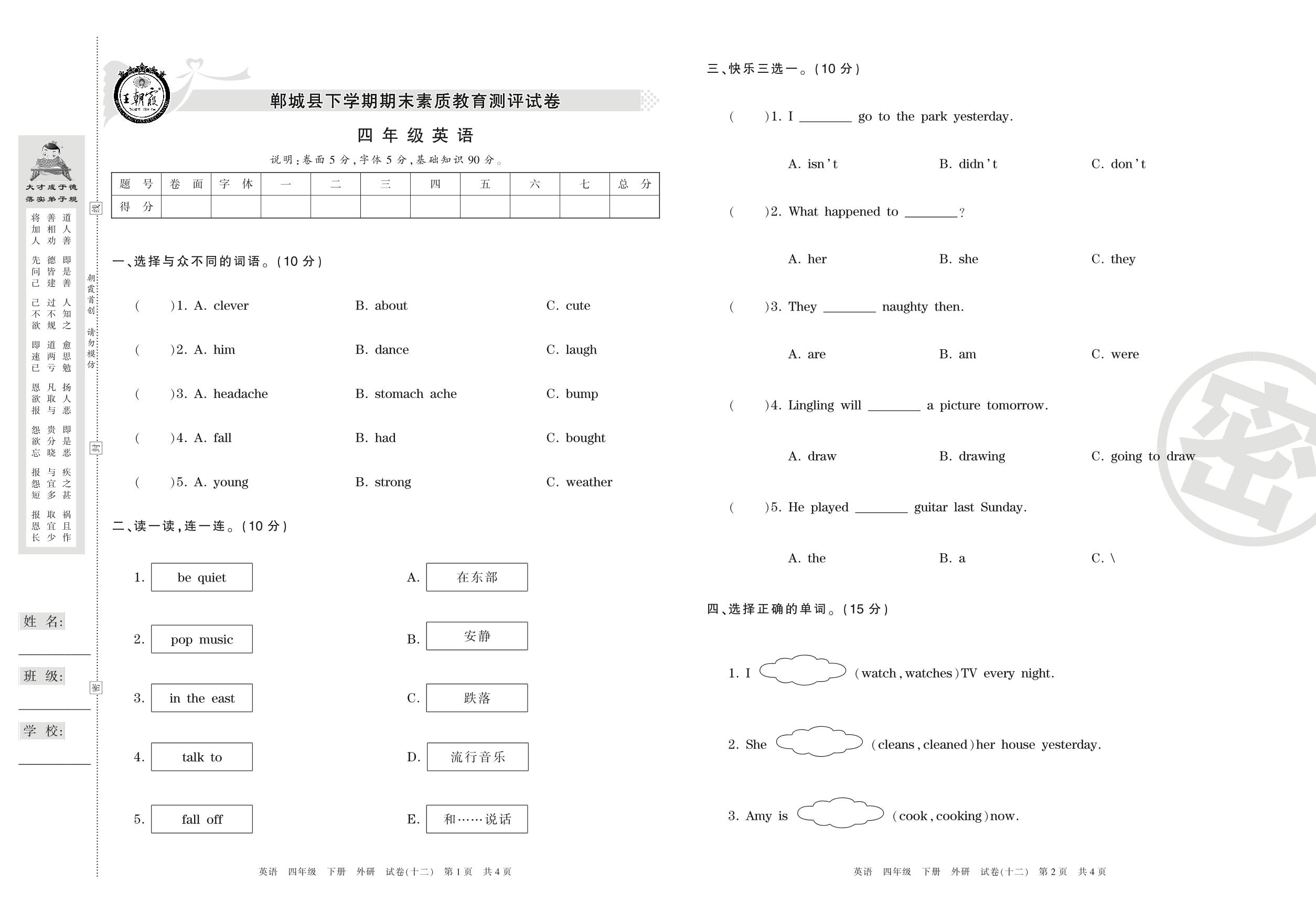 2015-2016学年第二学期周口市郸城县四年级英语试卷(外研版)【12】