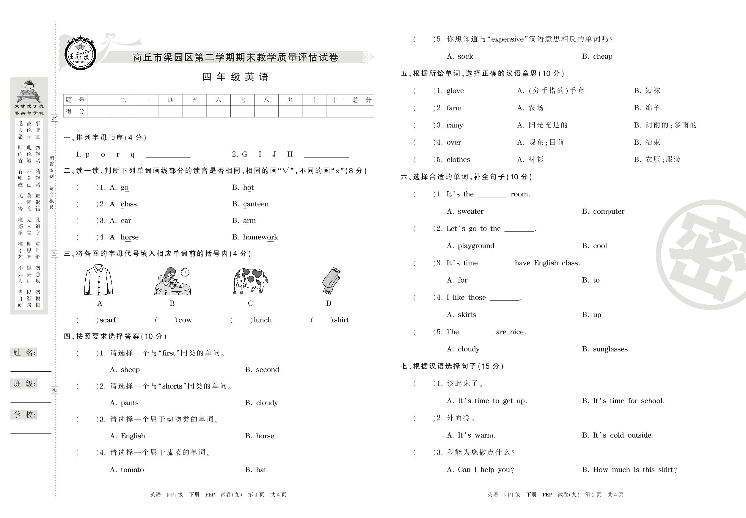 2015-2016学年第二学期商丘市梁园区四年级英语试卷(PEP版)【9】