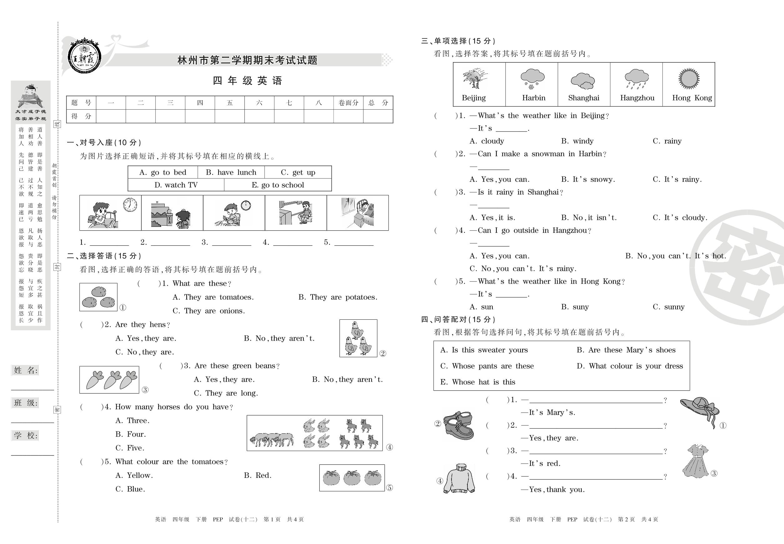 2015-2016学年第二学期林州市四年级英语试卷(PEP版)【12】