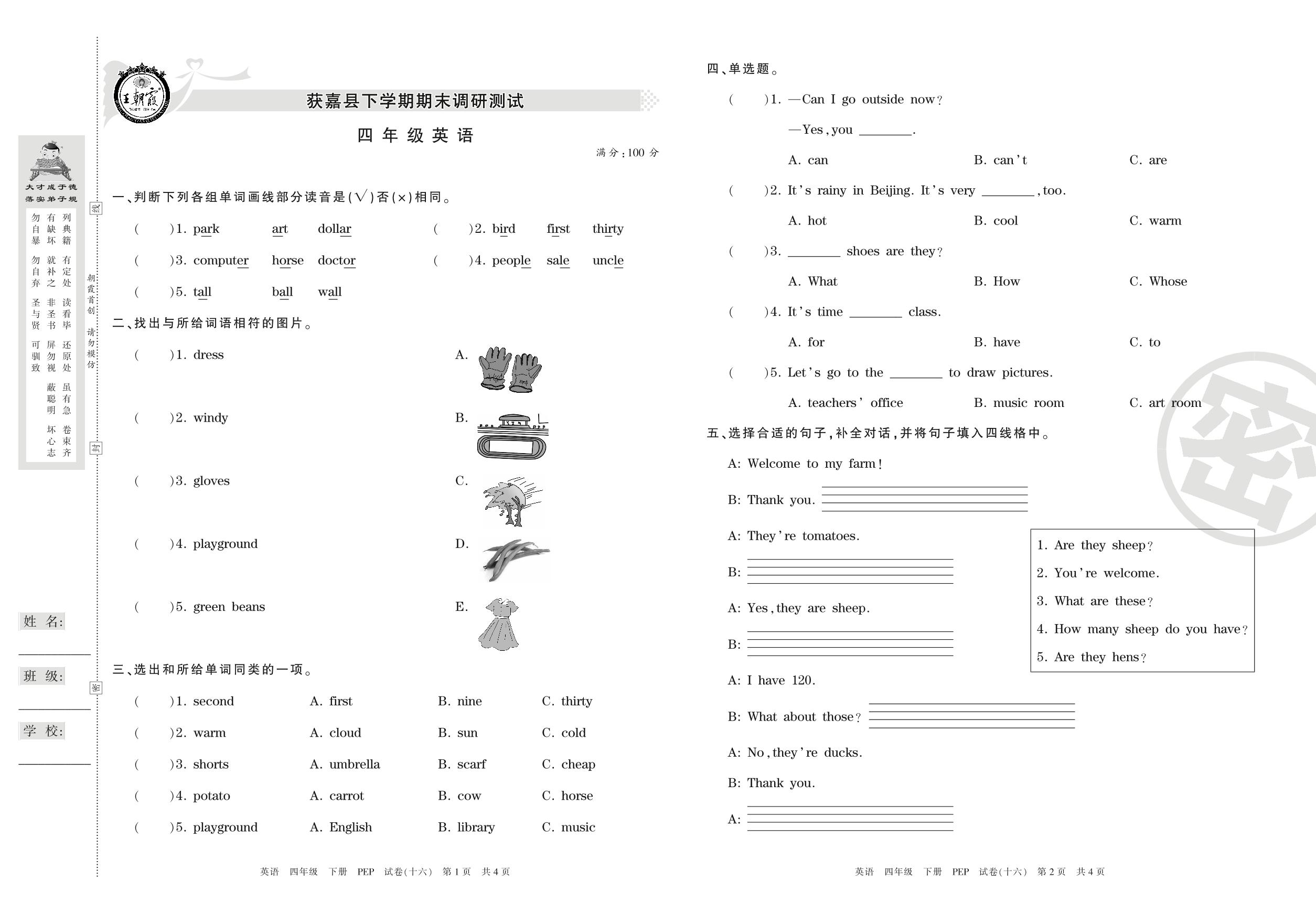 2015-2016学年第二学期新乡市获嘉县四年级英语试卷(PEP版)【16】