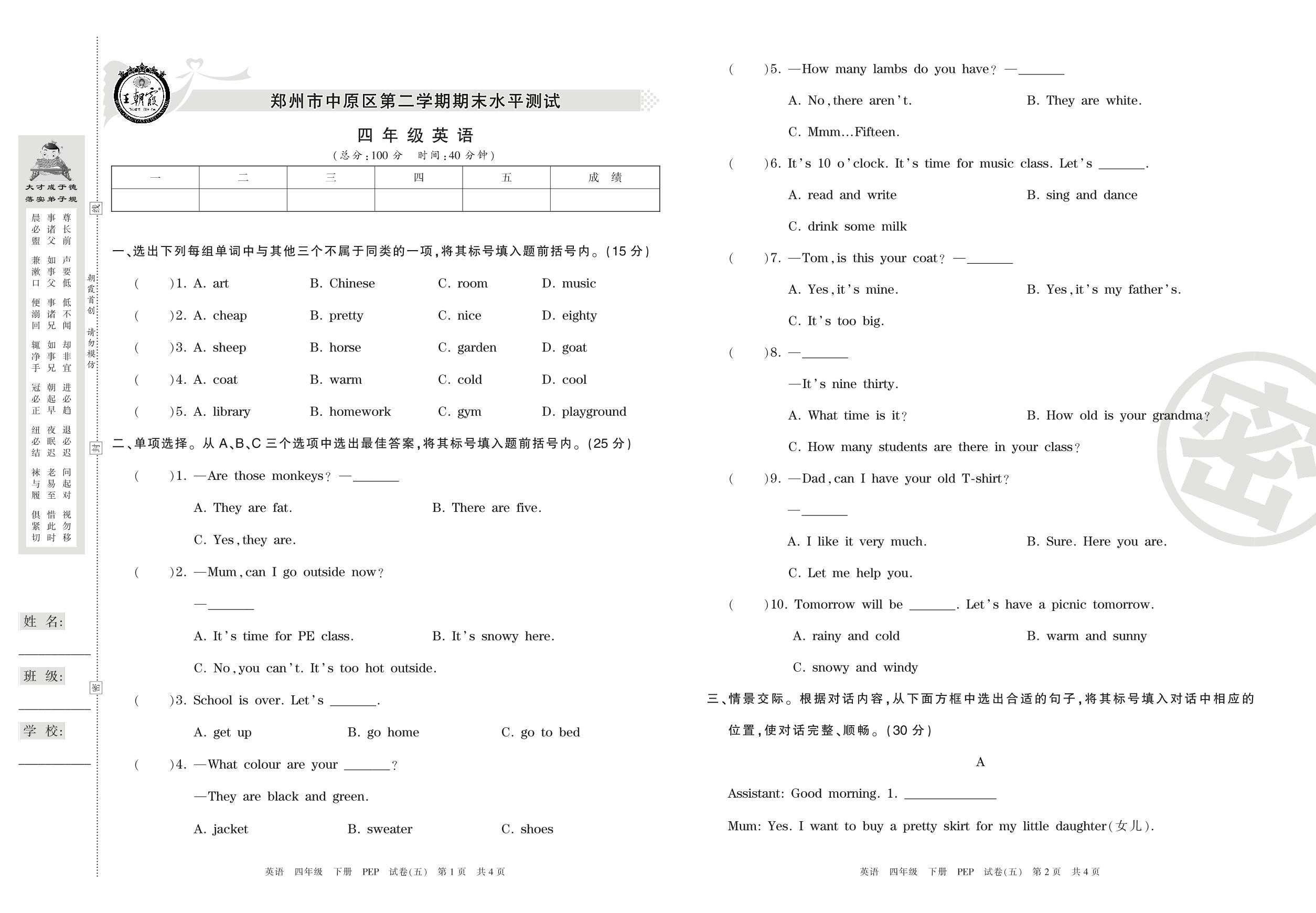 2015-2016学年第二学期郑州市中原区四年级英语试卷(PEP版)【5】
