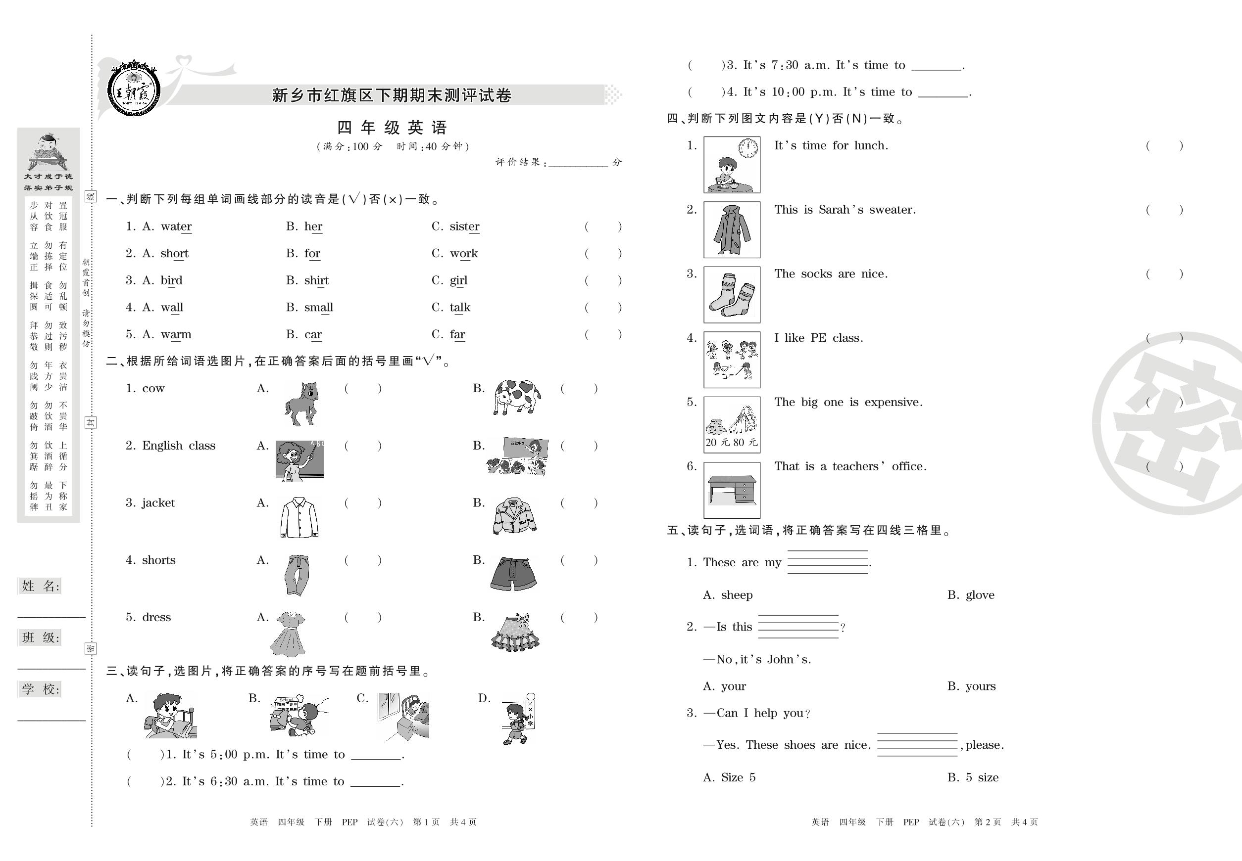 2015-2016学年第二学期新乡市红旗区四年级英语试卷(PEP版)【6】