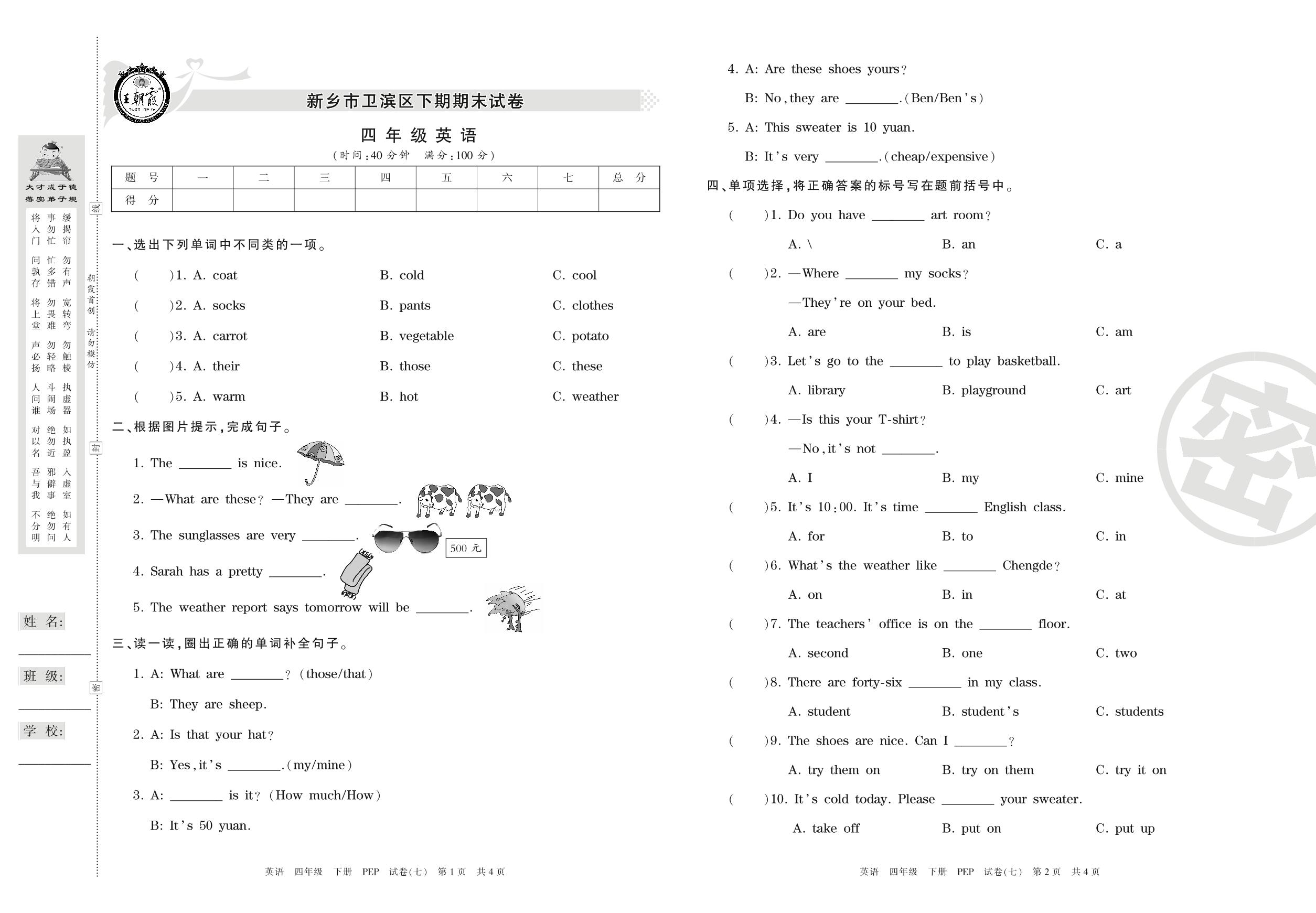 四年级英语人教PEP版(三起始)下册期末卷