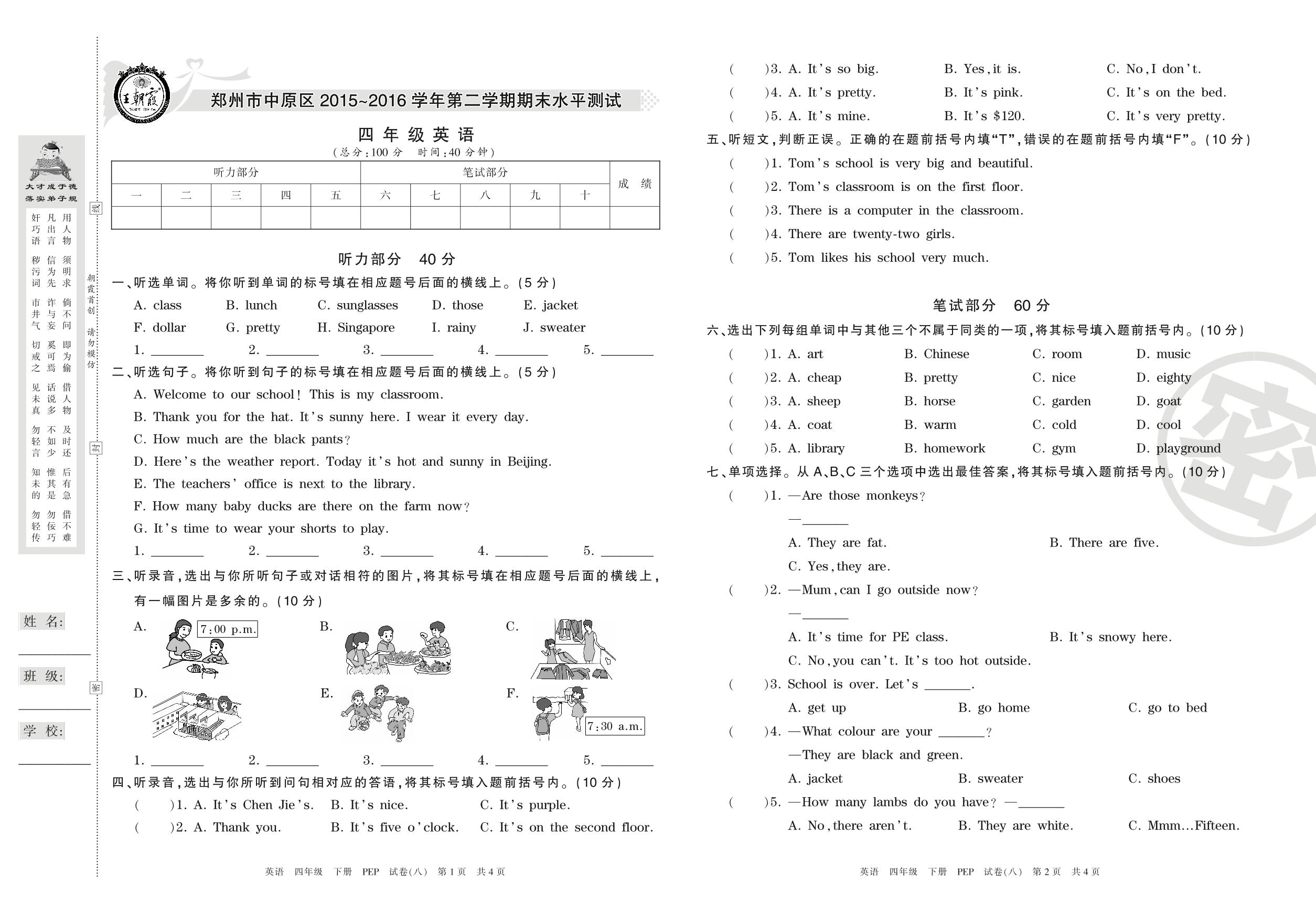 2015-2016学年第二学期郑州市中原区四年级英语试卷(PEP版)【8】