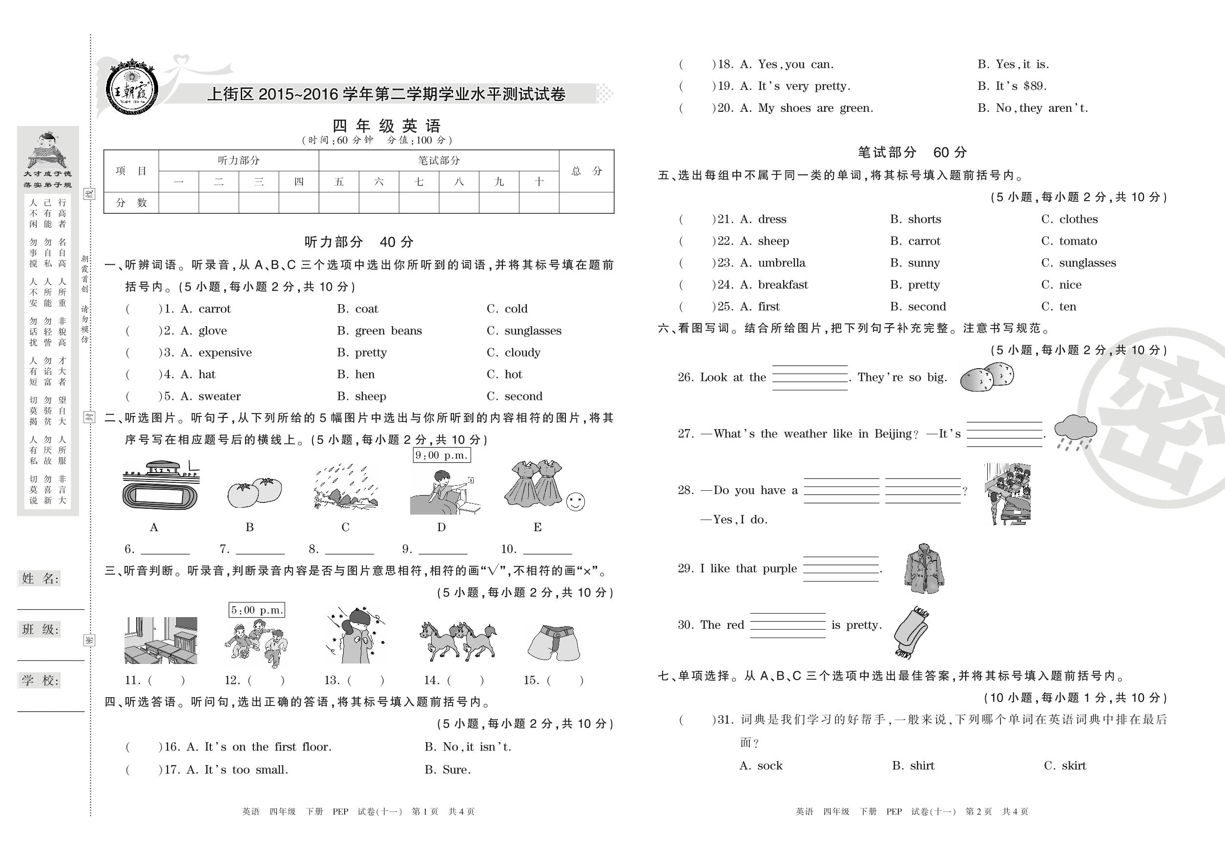 四年级英语人教PEP版(三起始)下册期末卷