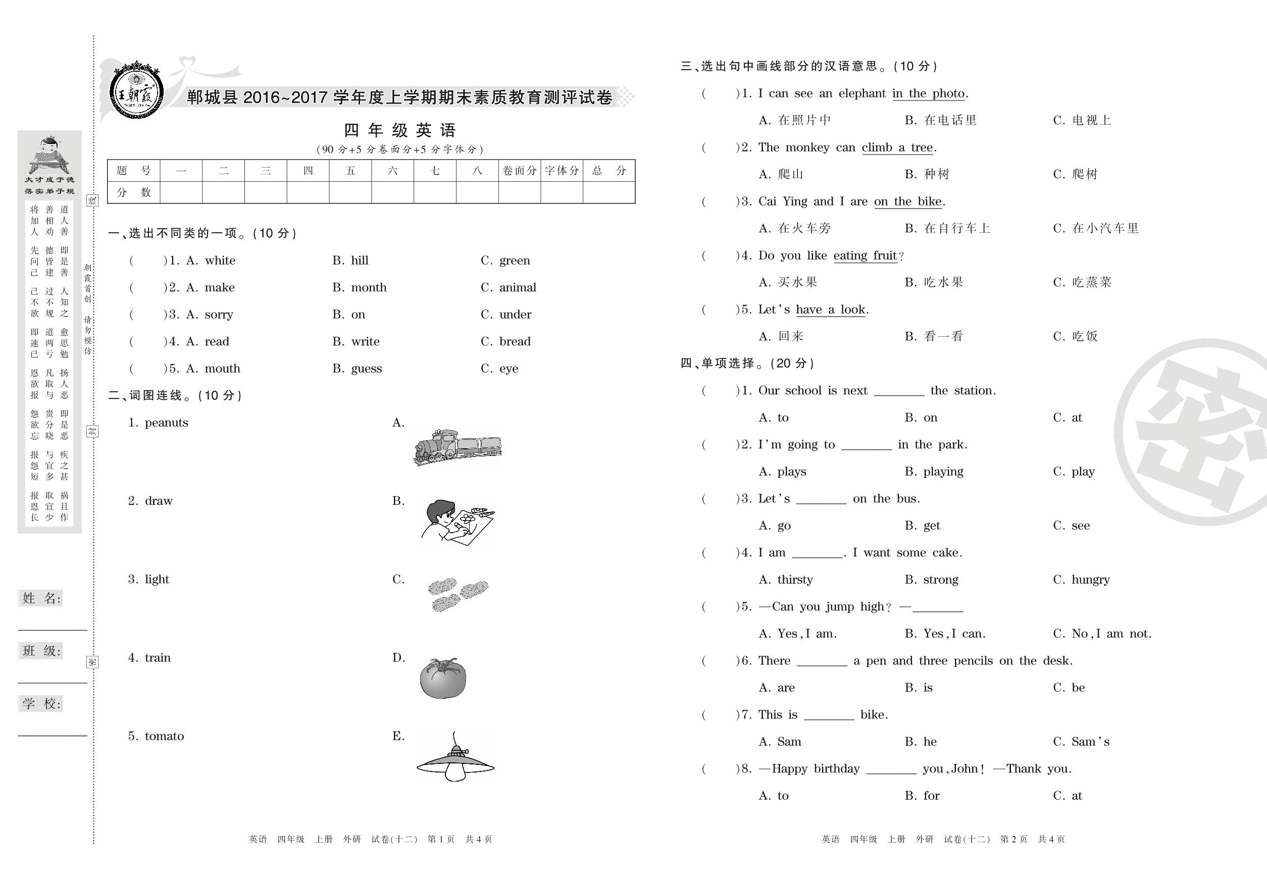 四年级英语外研版(三起始)上册期末卷