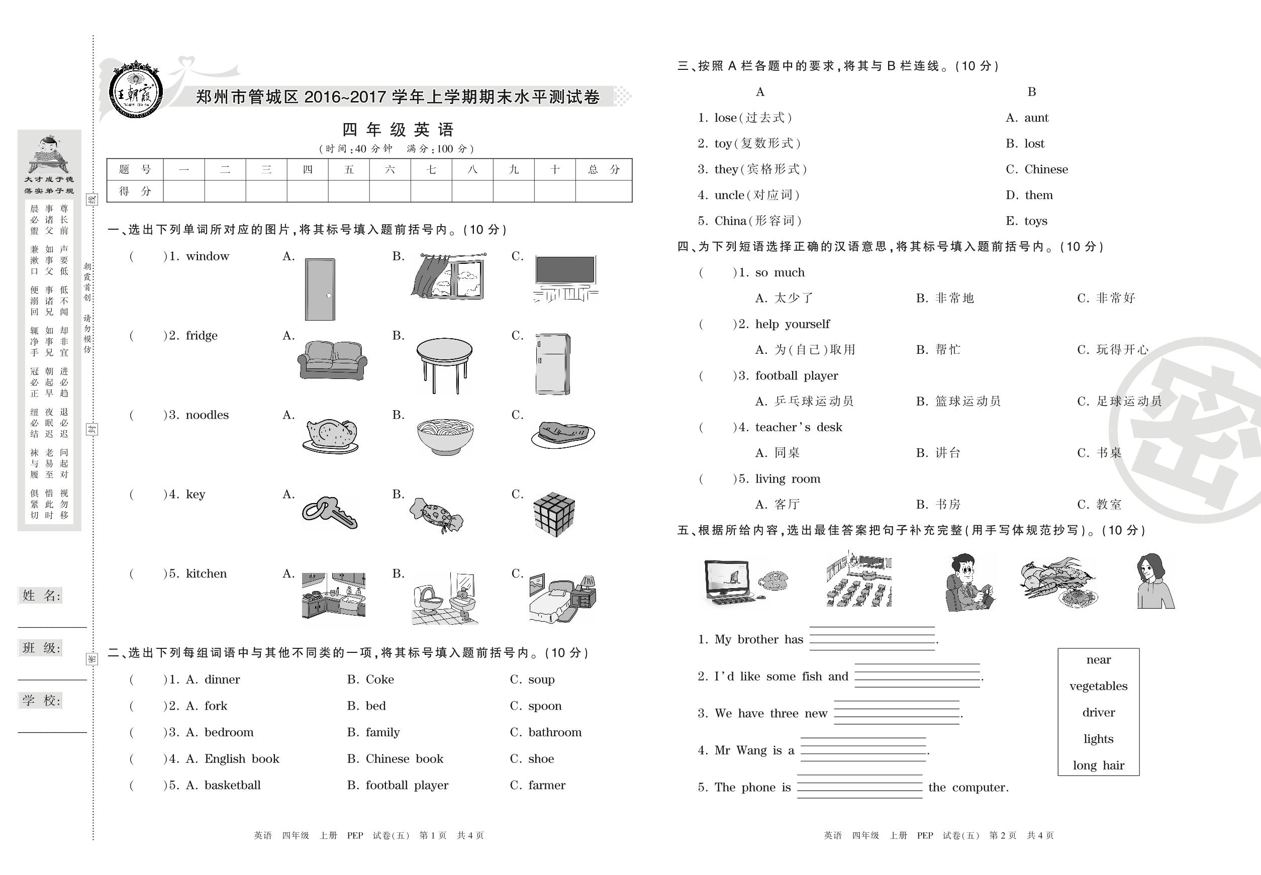 2016-2017学年第一学期郑州市管城区四年级英语试卷(PEP版)【5】