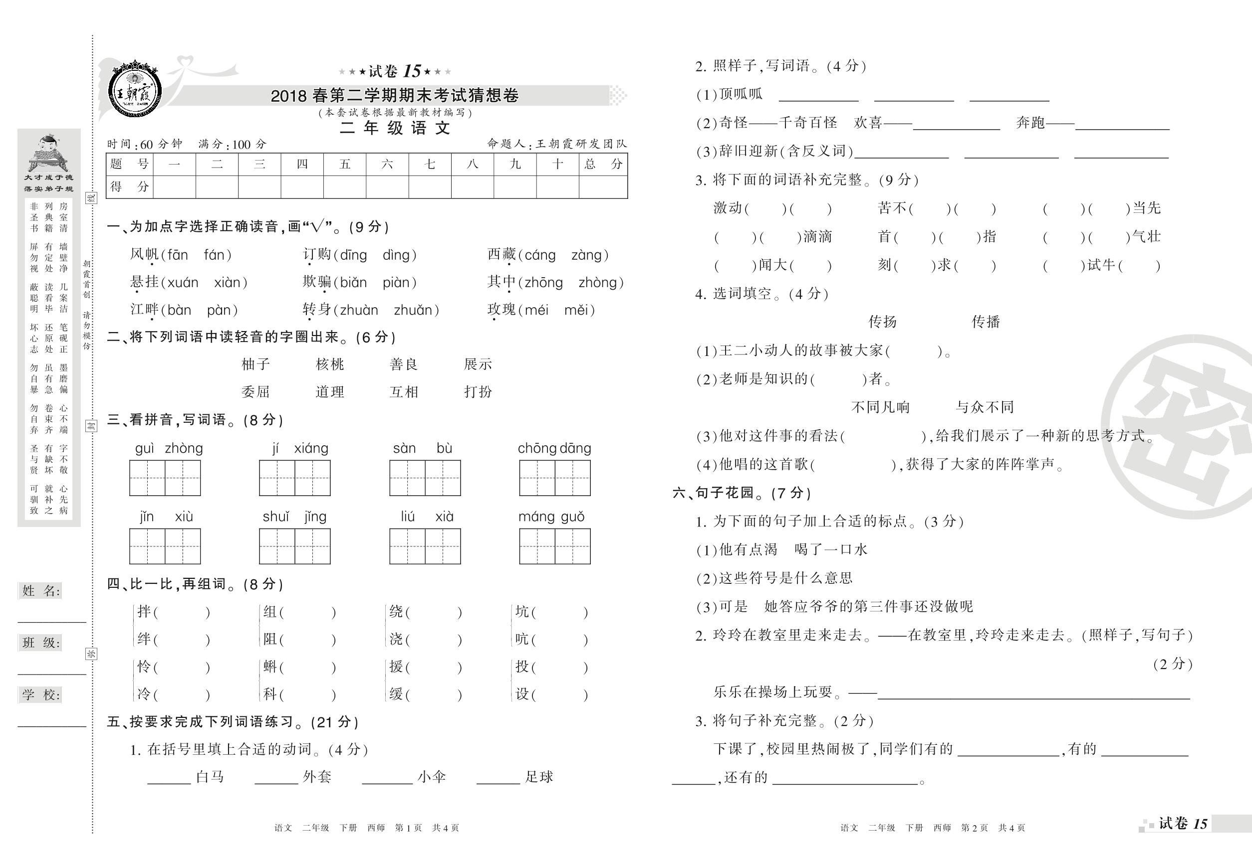 王朝霞期末猜想卷二年级下册语文(西师版)【15】