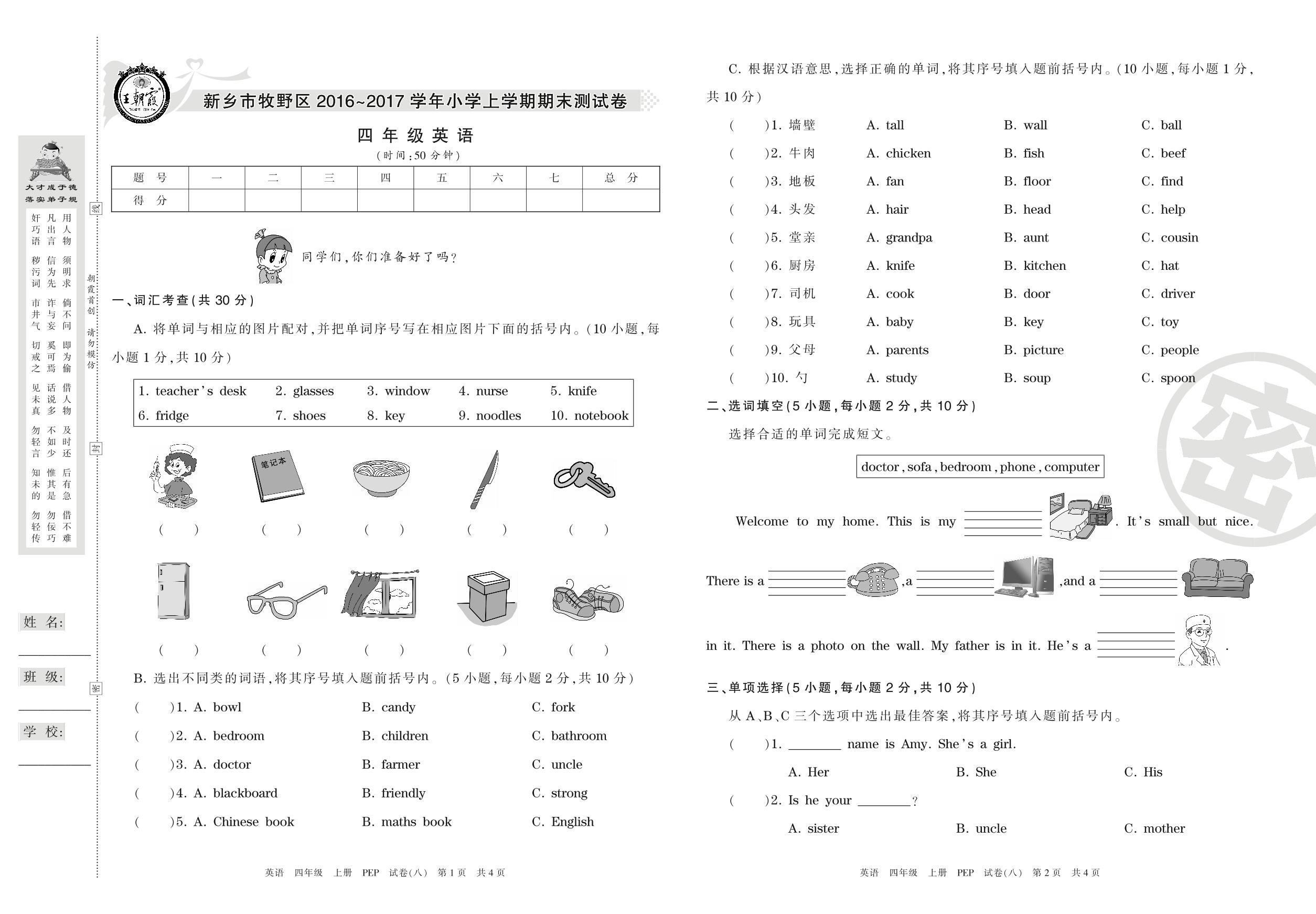 2016-2017学年第一学期新乡市牧野区四年级英语试卷(PEP版)【8】