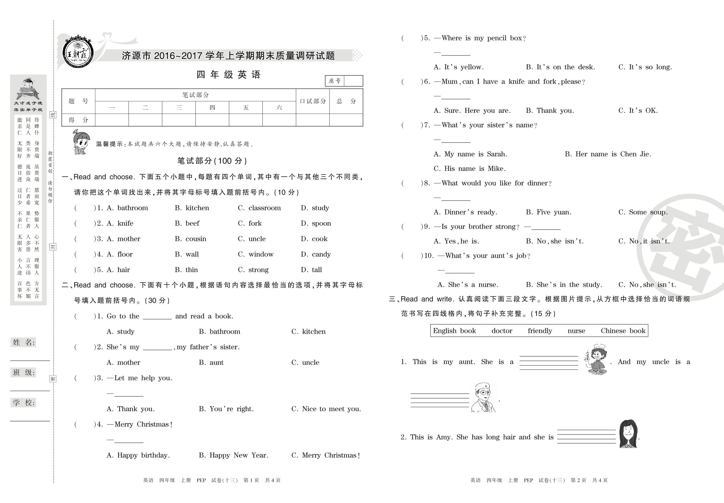 2016-2017学年第一学期济源市四年级英语试卷(PEP版)【13】