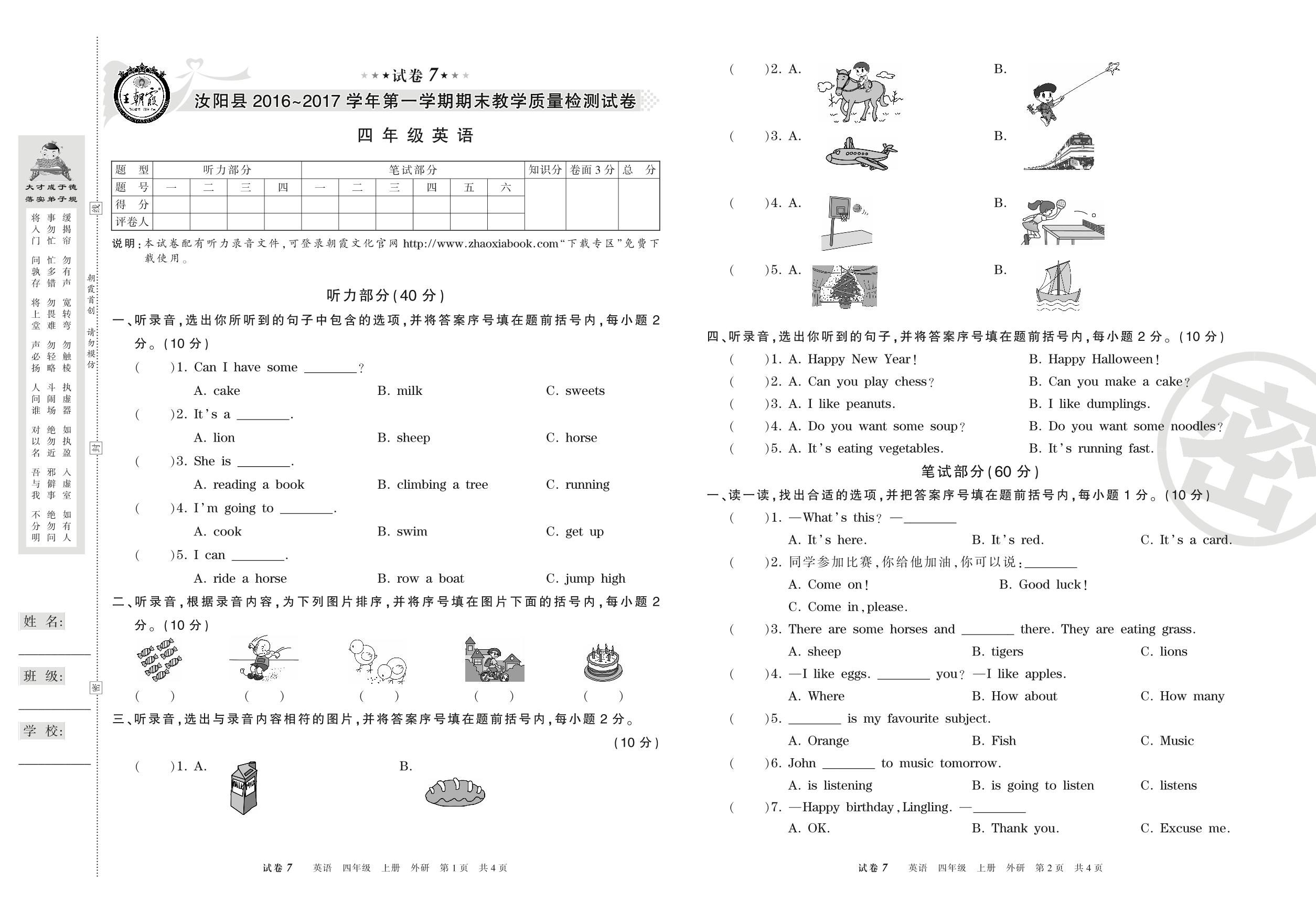 2016-2017学年第一学期洛阳市汝阳县四年级英语试卷(外研版)【7】