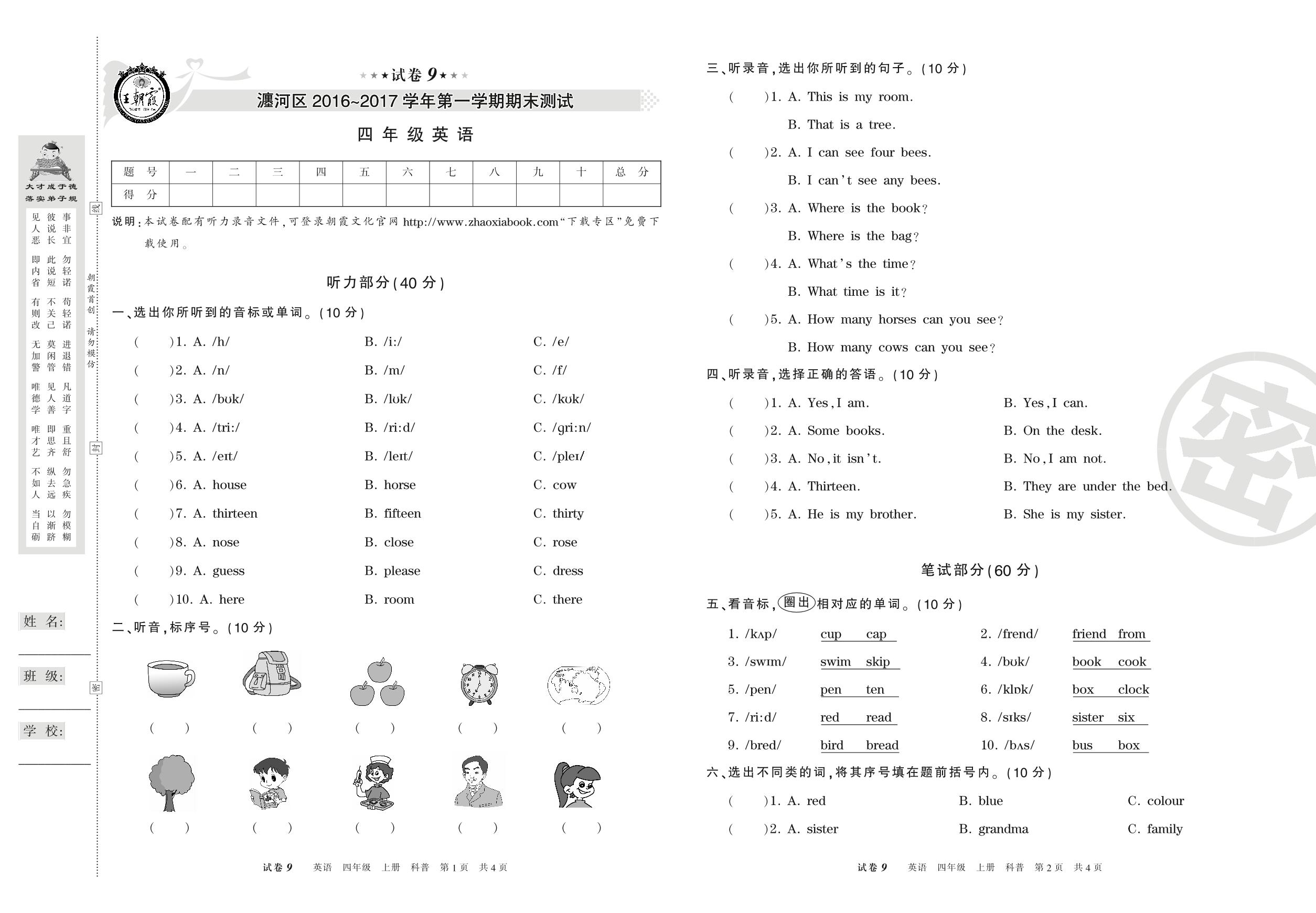 2016-2017学年第一学期洛阳市瀍河区四年级英语试卷(科普版)【9】