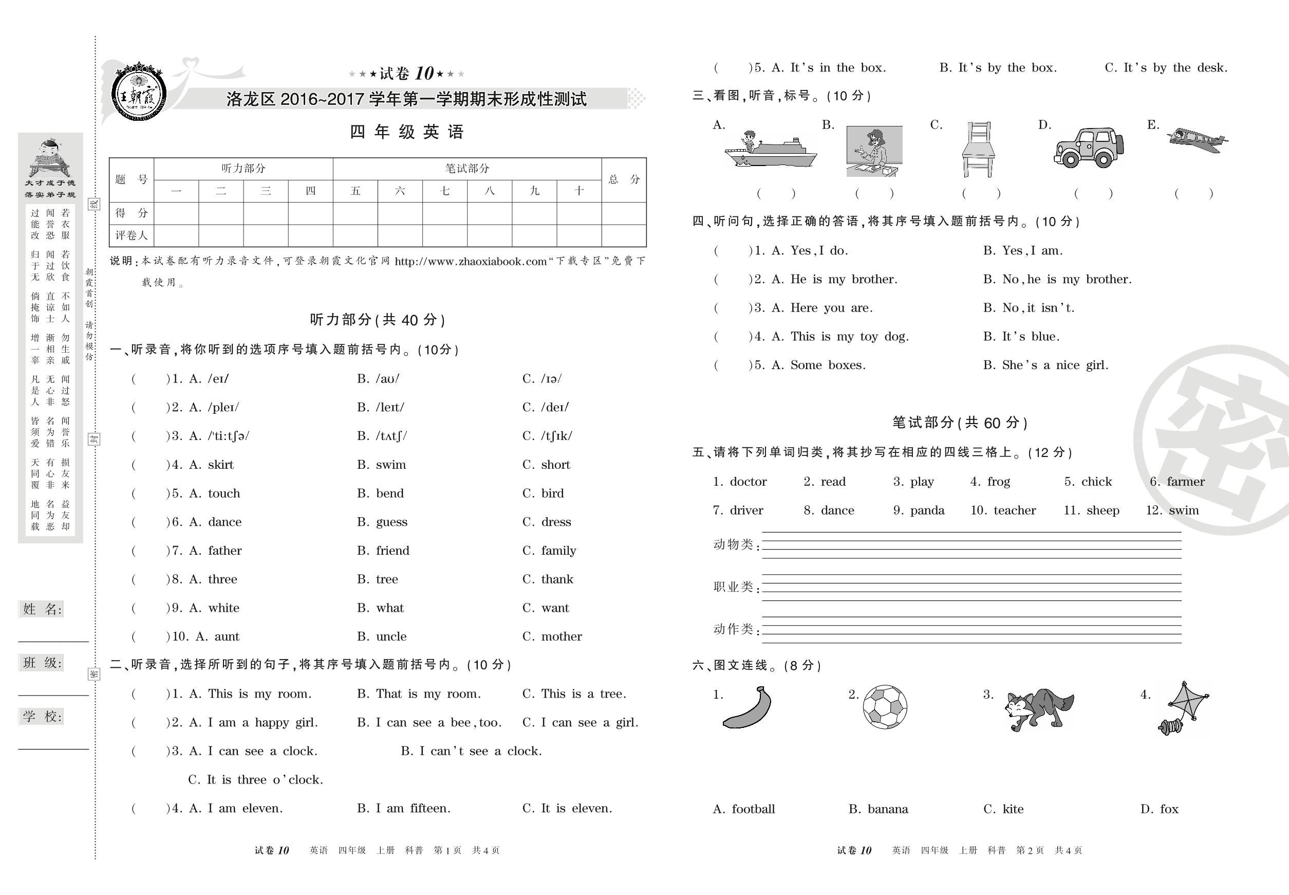 2016-2017学年第一学期洛阳市洛龙区四年级英语试卷(科普版)【10】