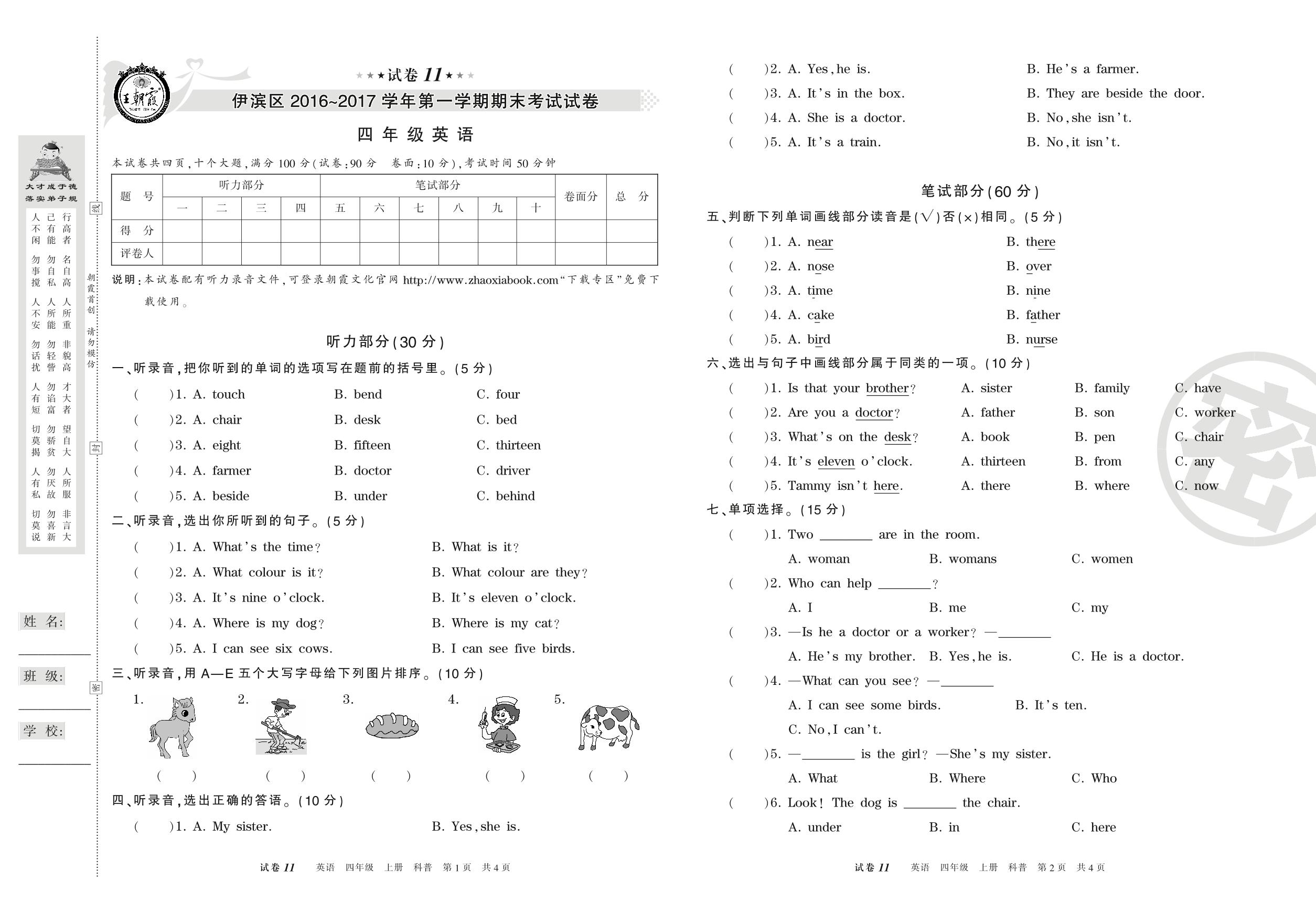 2016-2017学年第一学期洛阳市伊滨区四年级英语试卷(科普版)【11】