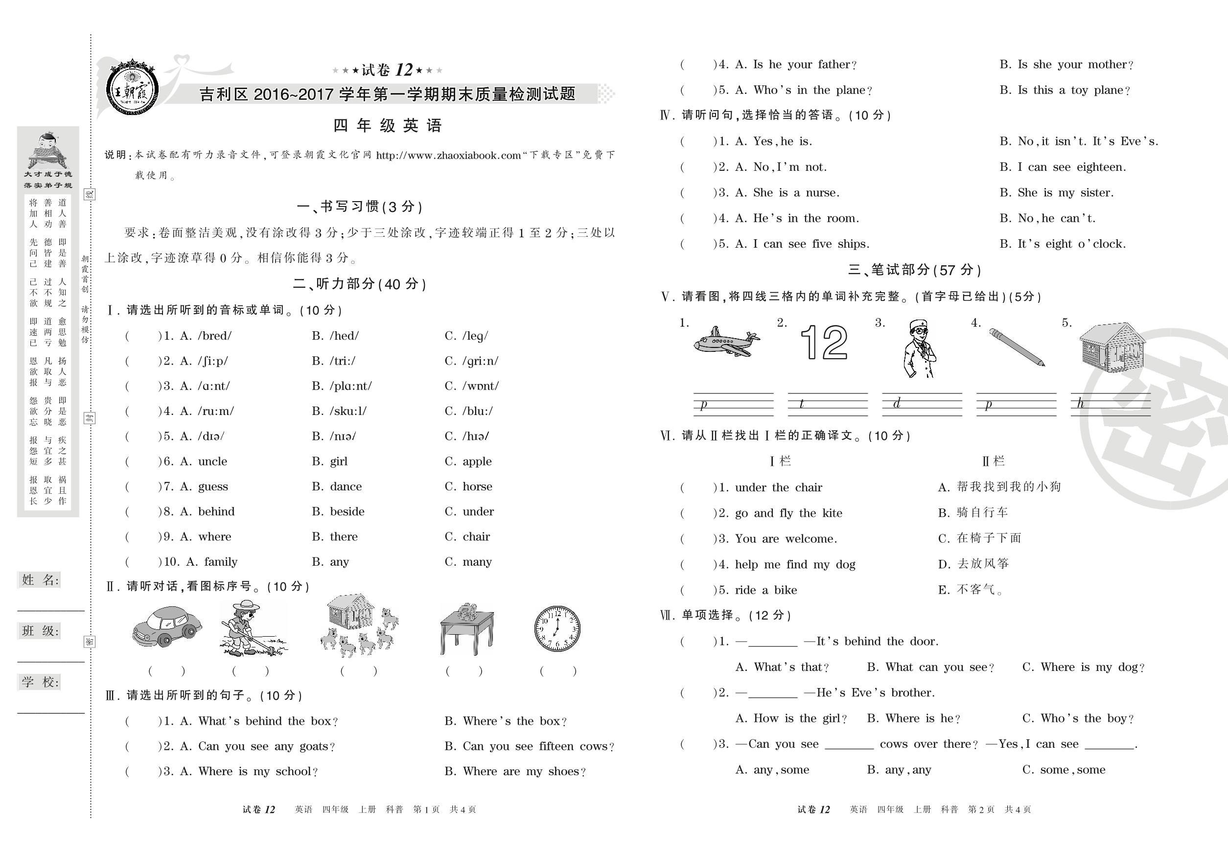 2016-2017学年第一学期洛阳市吉利区四年级英语试卷(科普版)【12】