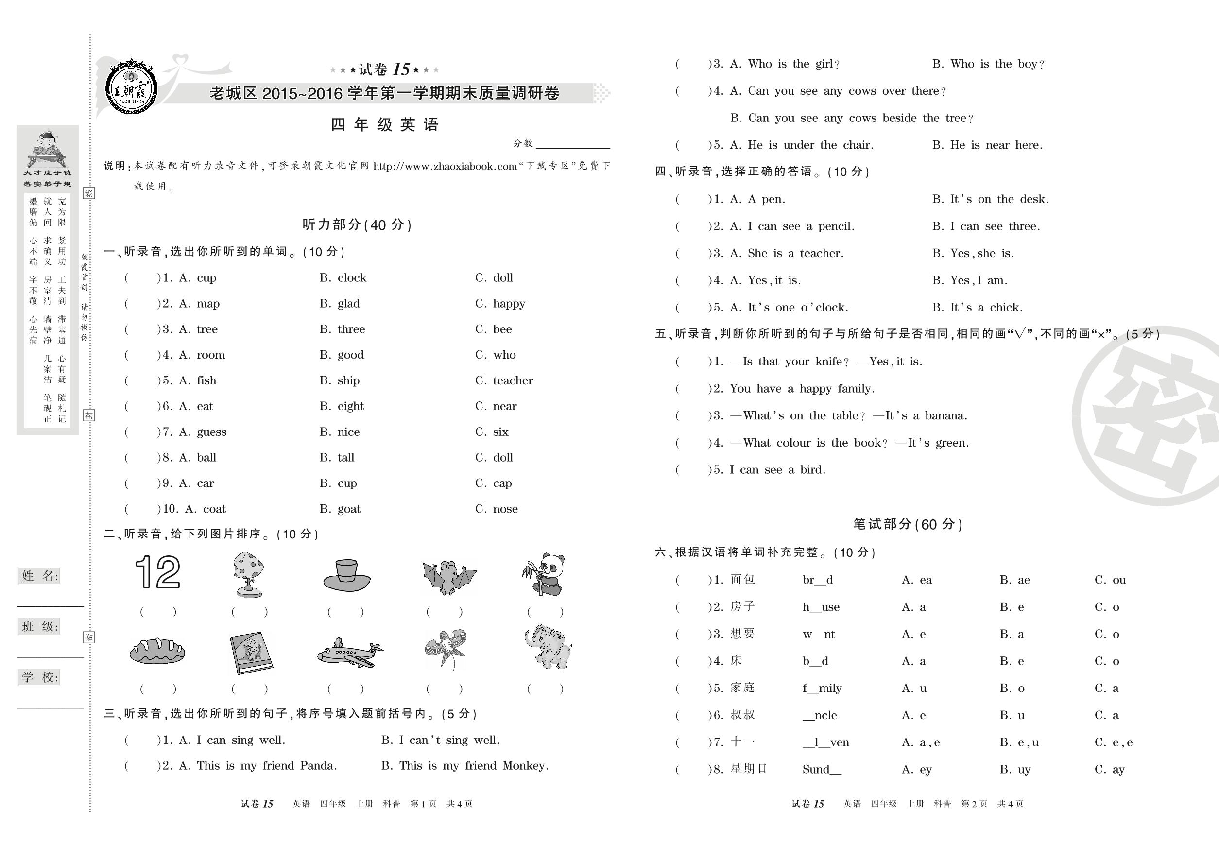2015-2016学年第一学期洛阳市老城区四年级英语试卷(科普版)【15】