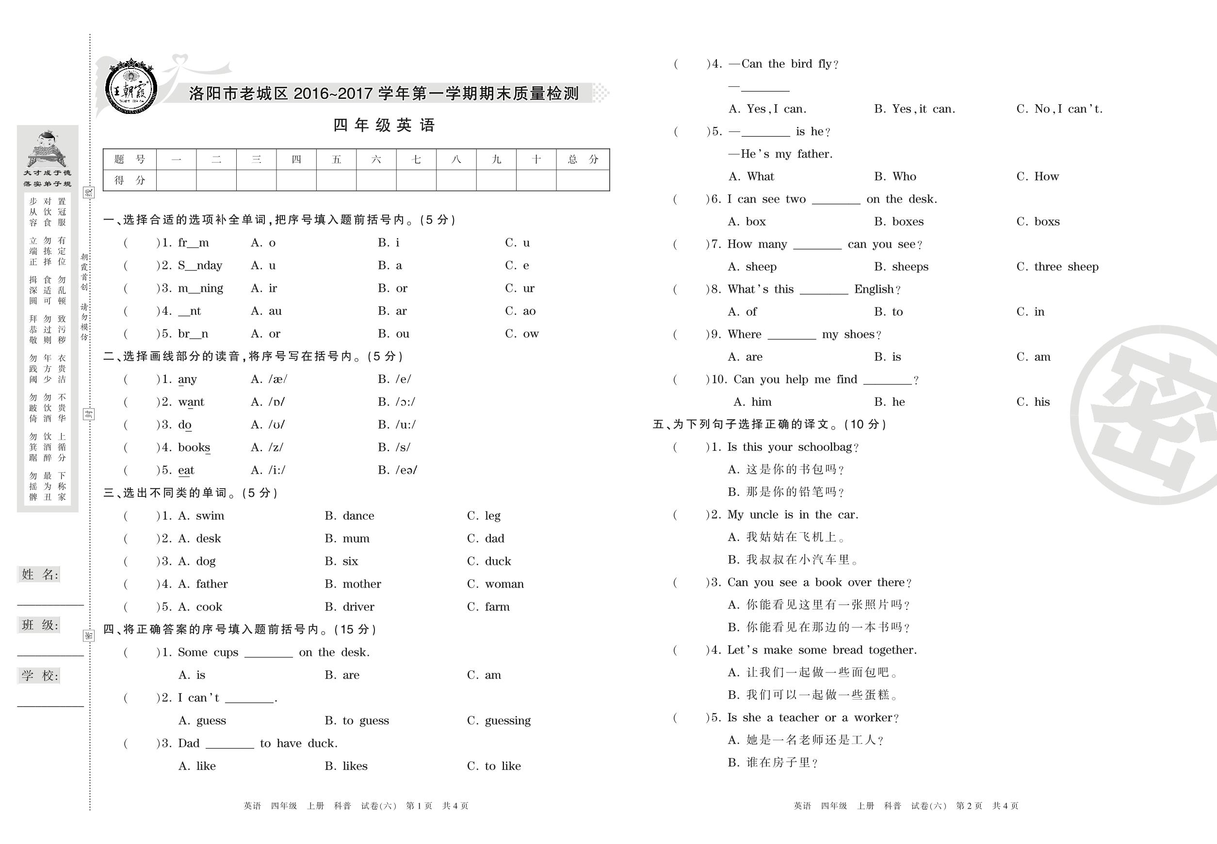 2016-2017学年第一学期洛阳市老城区四年级英语试卷(科普版)【6】