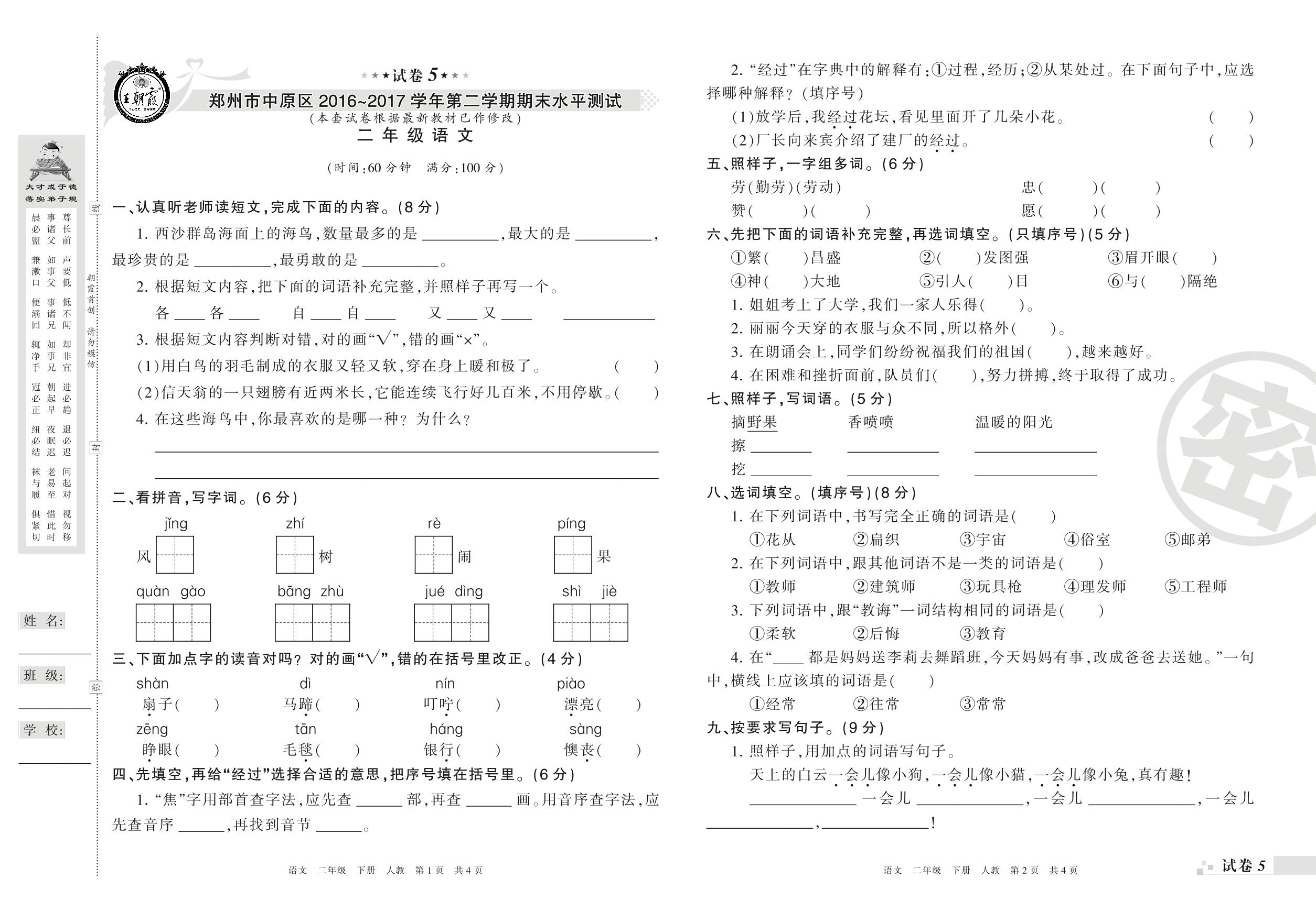 2016-2017学年第二学期郑州市中原区二年级语文试卷(人教版)【5】