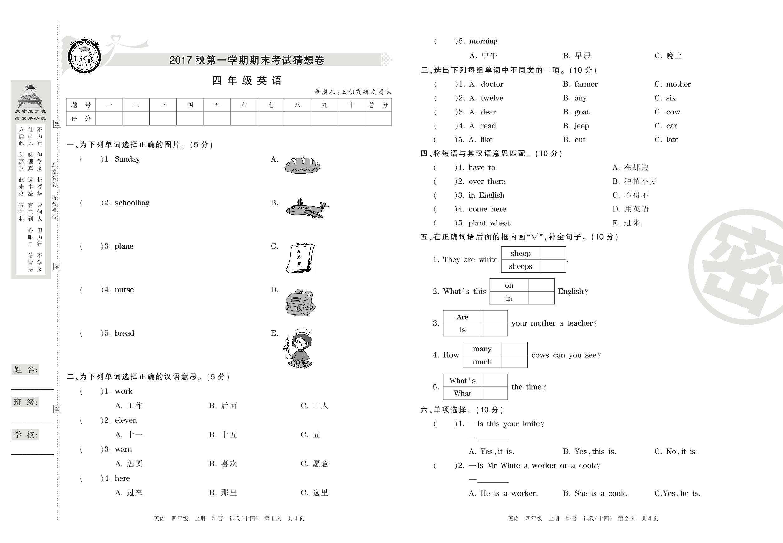 王朝霞期末猜想卷四年级上册英语(科普版)【14】